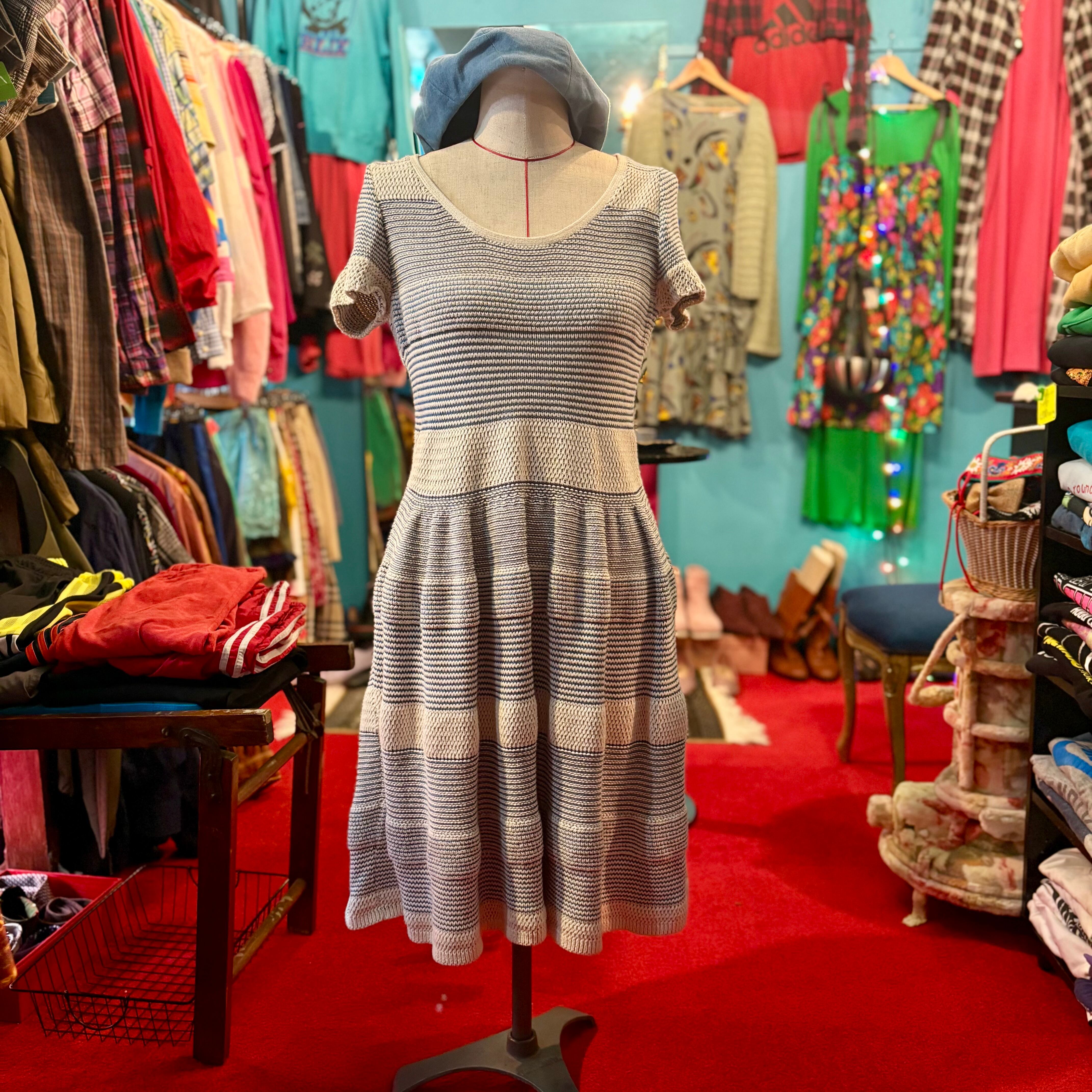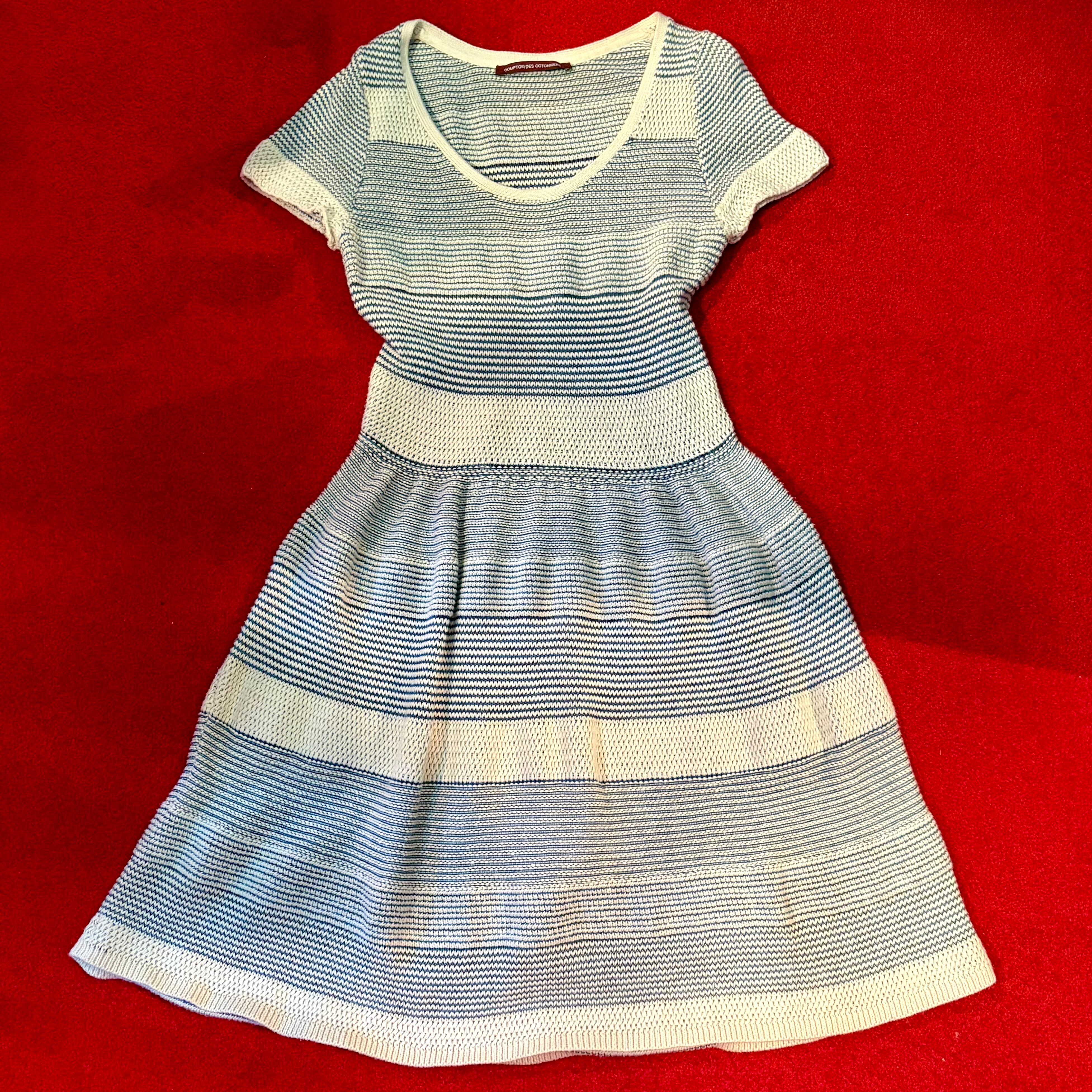 くすみ感のあるブルーとホワイトの変形ボーダー柄ニットワンピース。