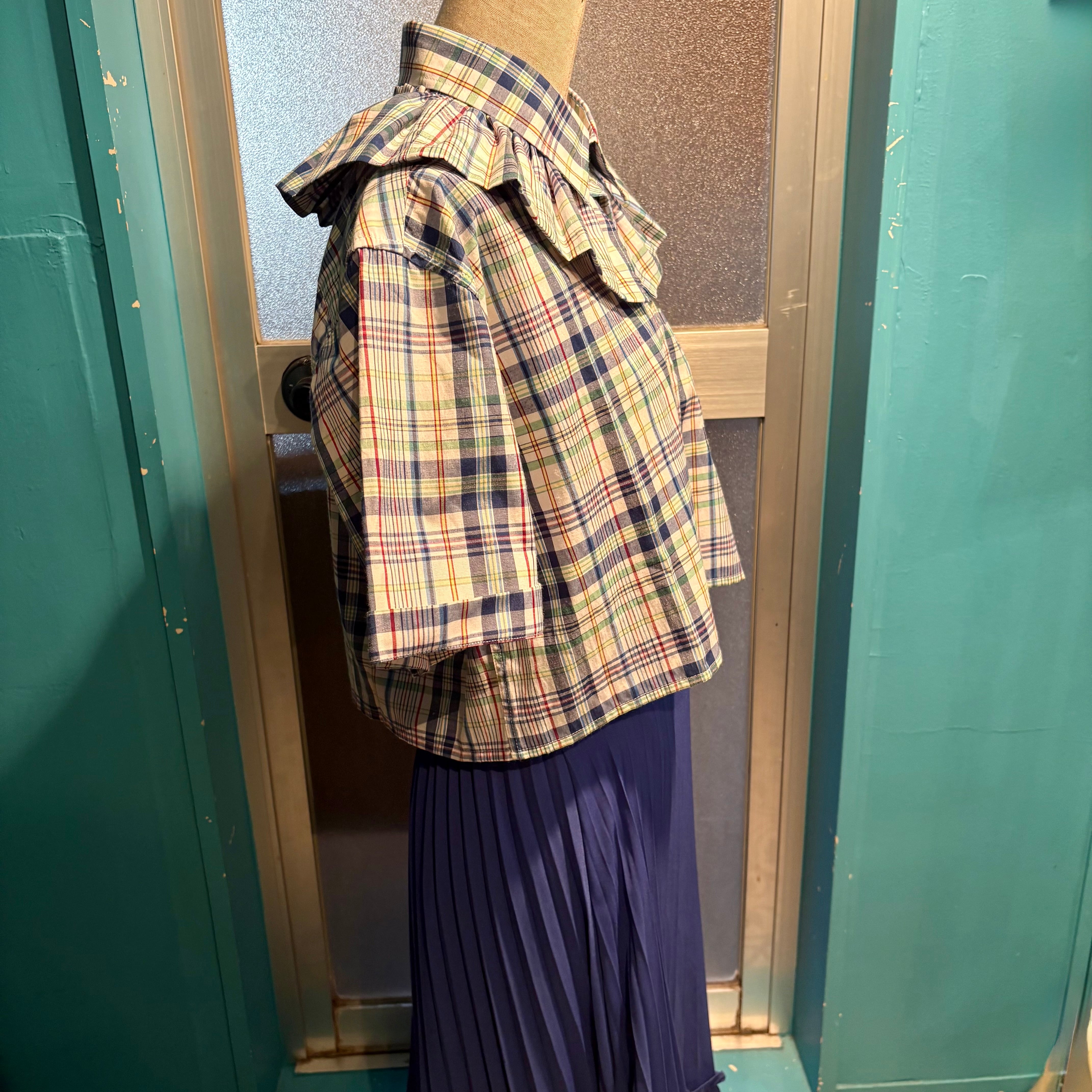 handmade SAYANG リメイクフリルシャツ ブルー系 マドラスチェック 青 白