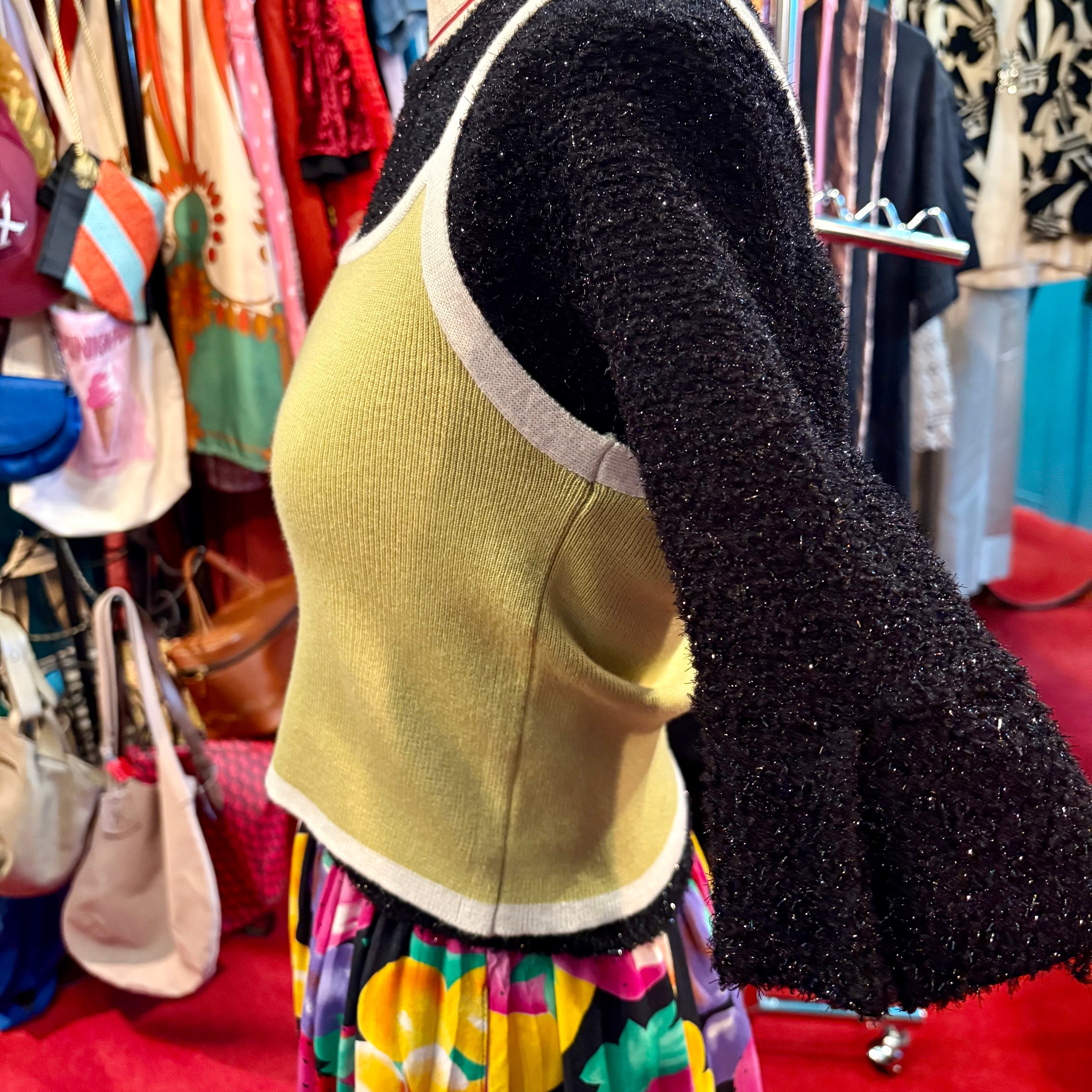 オリーブグリーンにオフホワイトの縁取りがシンプルかわいいニットキャミ。