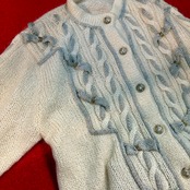 ベースは定番アランニットのような編み目のニットカーディガンですが、ラメ混のニットコードがリボンのように編み込まれた唯一無二なデザインが素敵です。