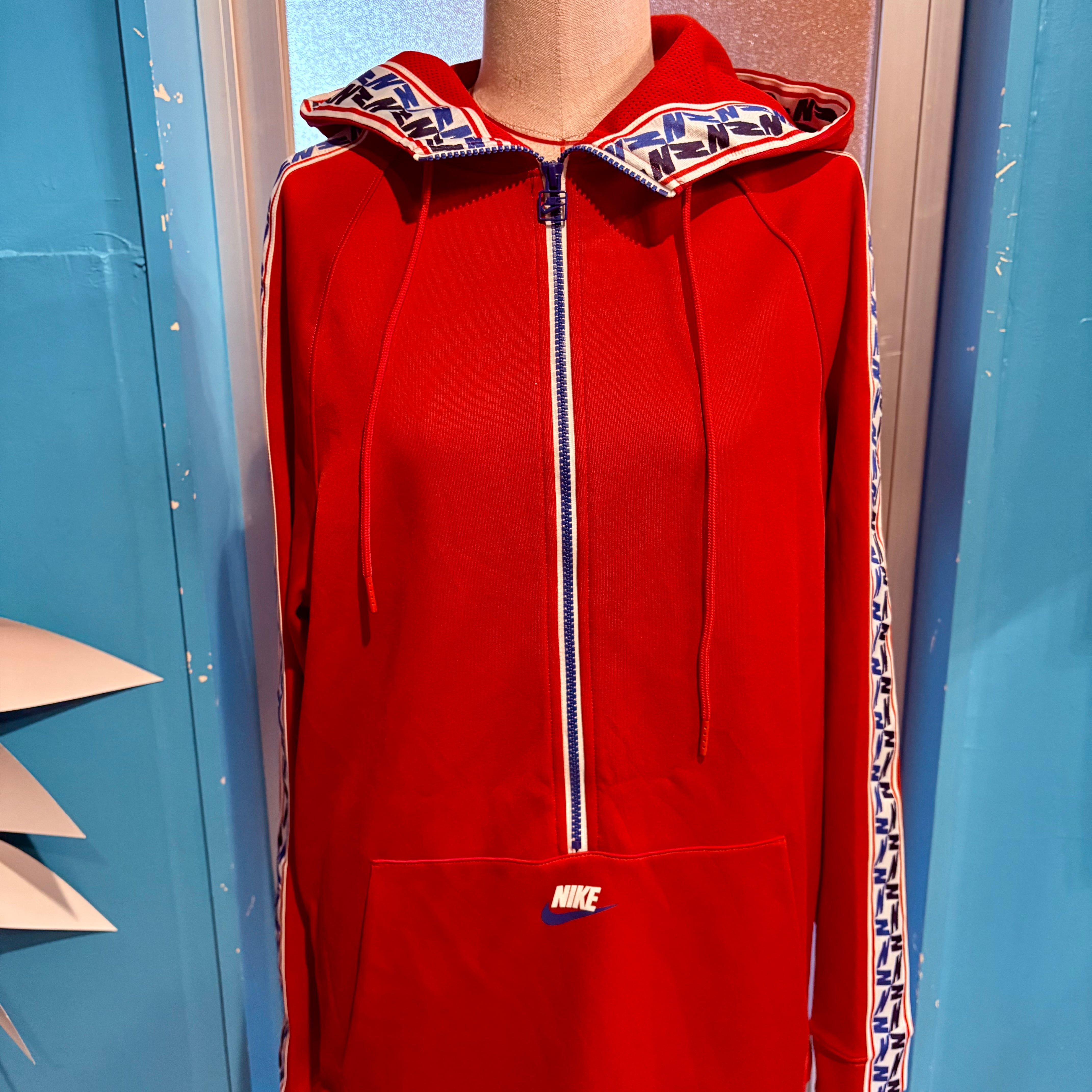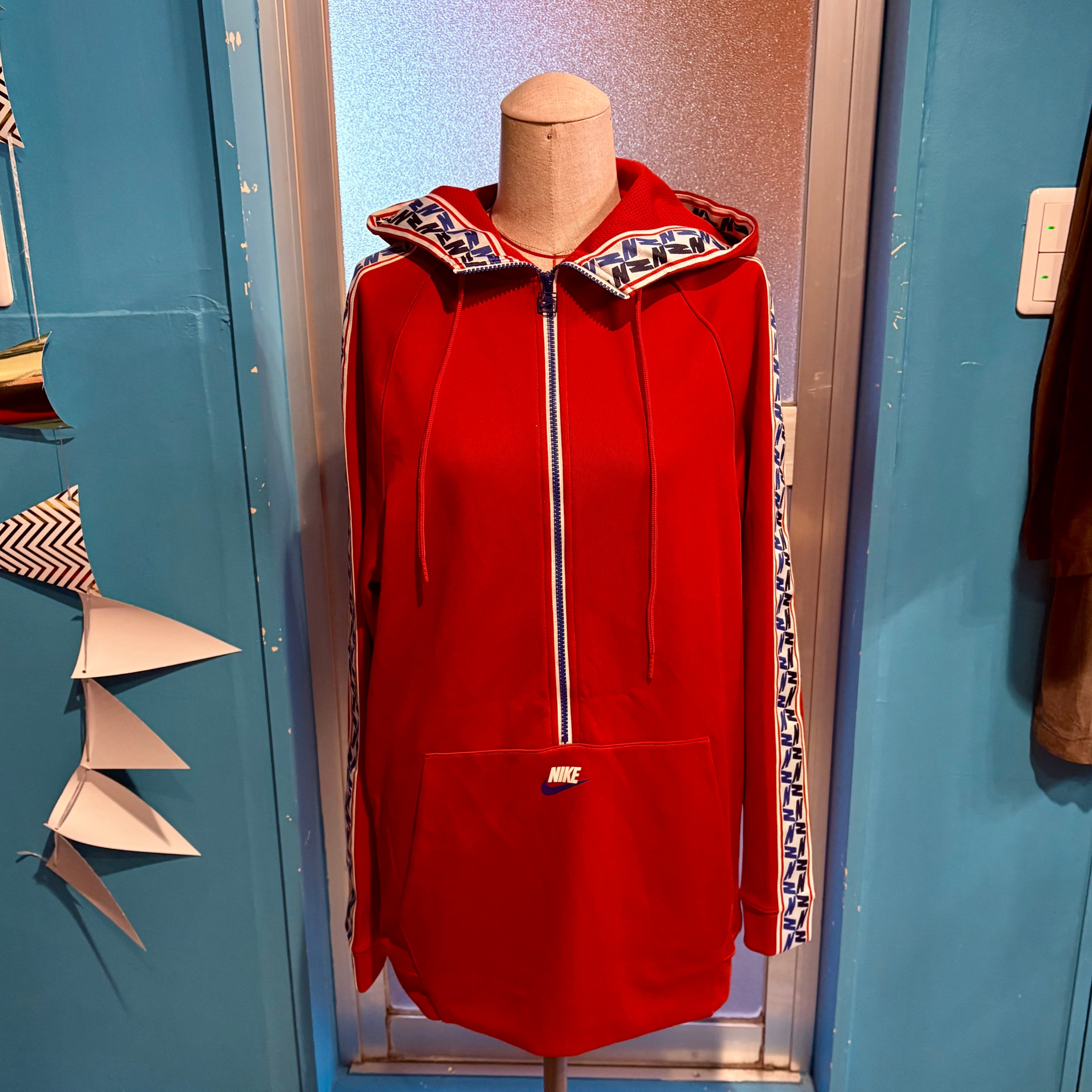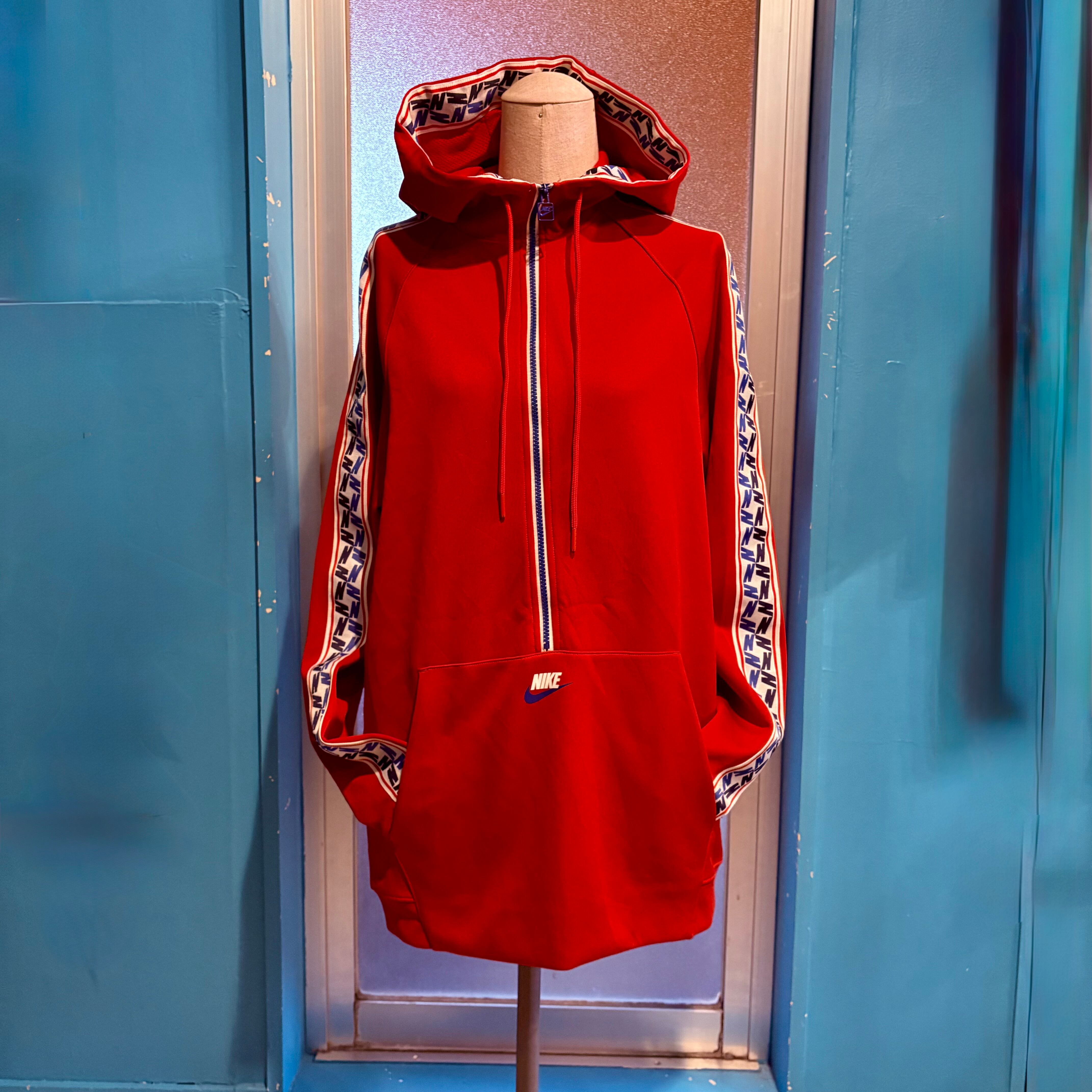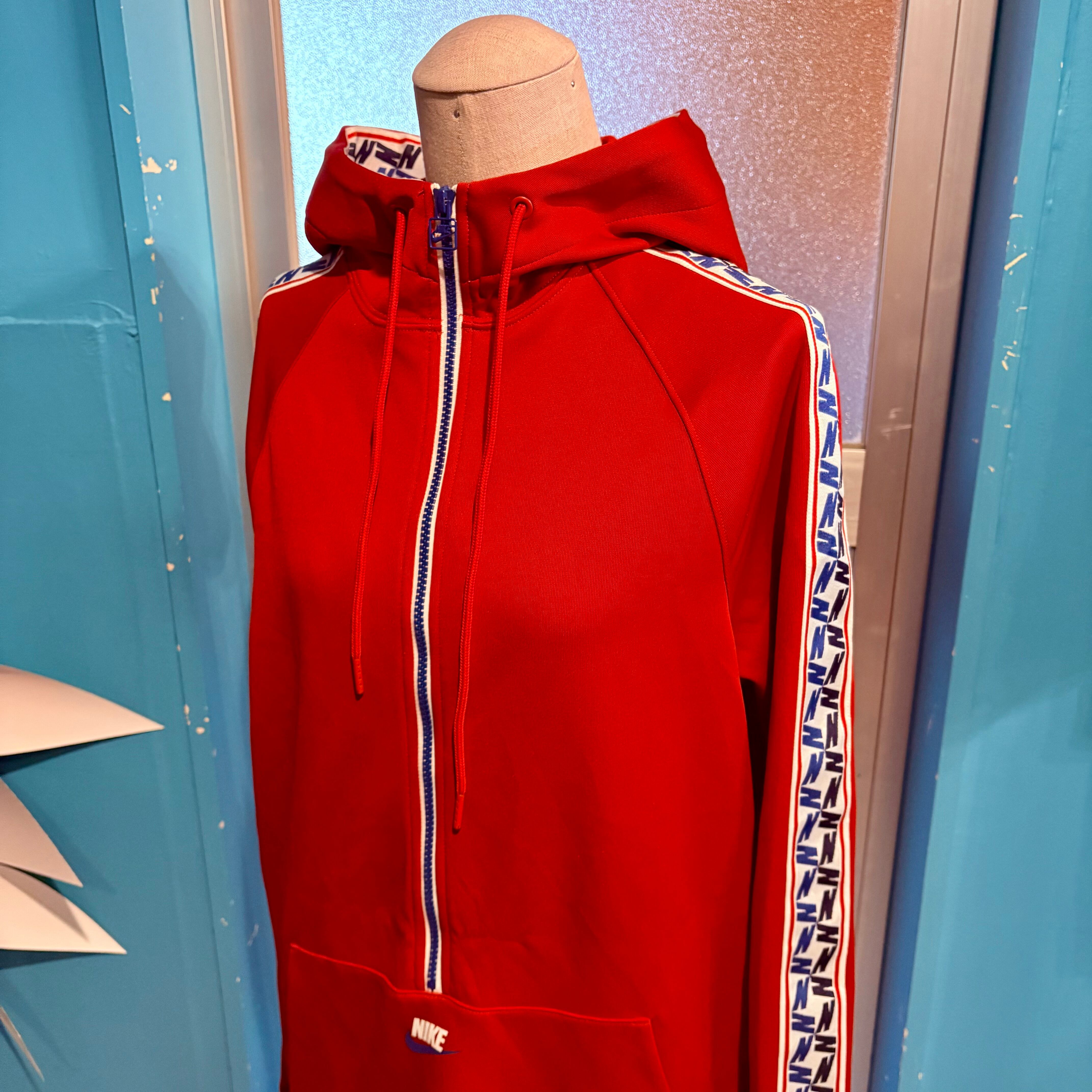 長めのハーフジップがめずらしい、あまり見たことないタイプのNIKEの真っ赤なプルオーバーパーカー。