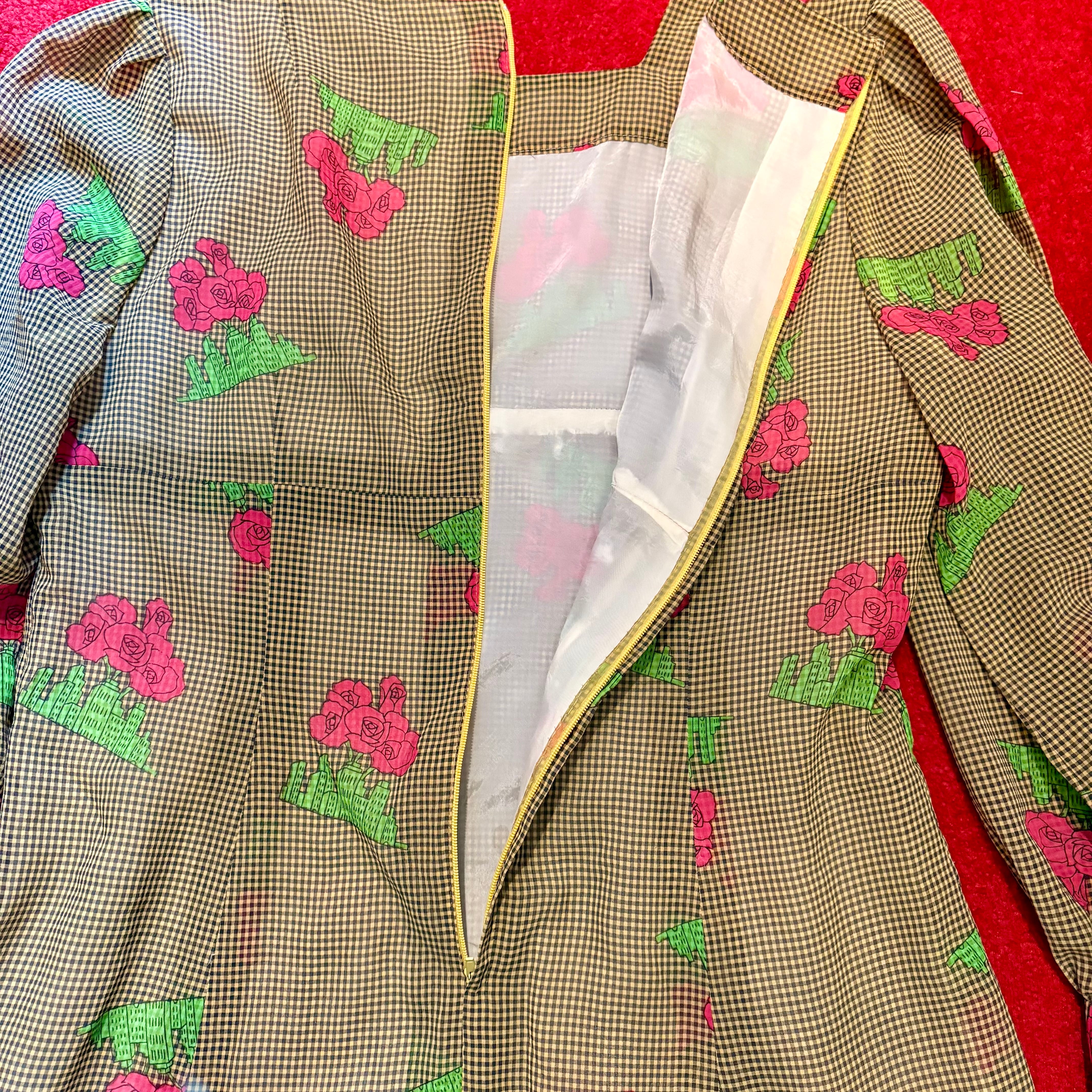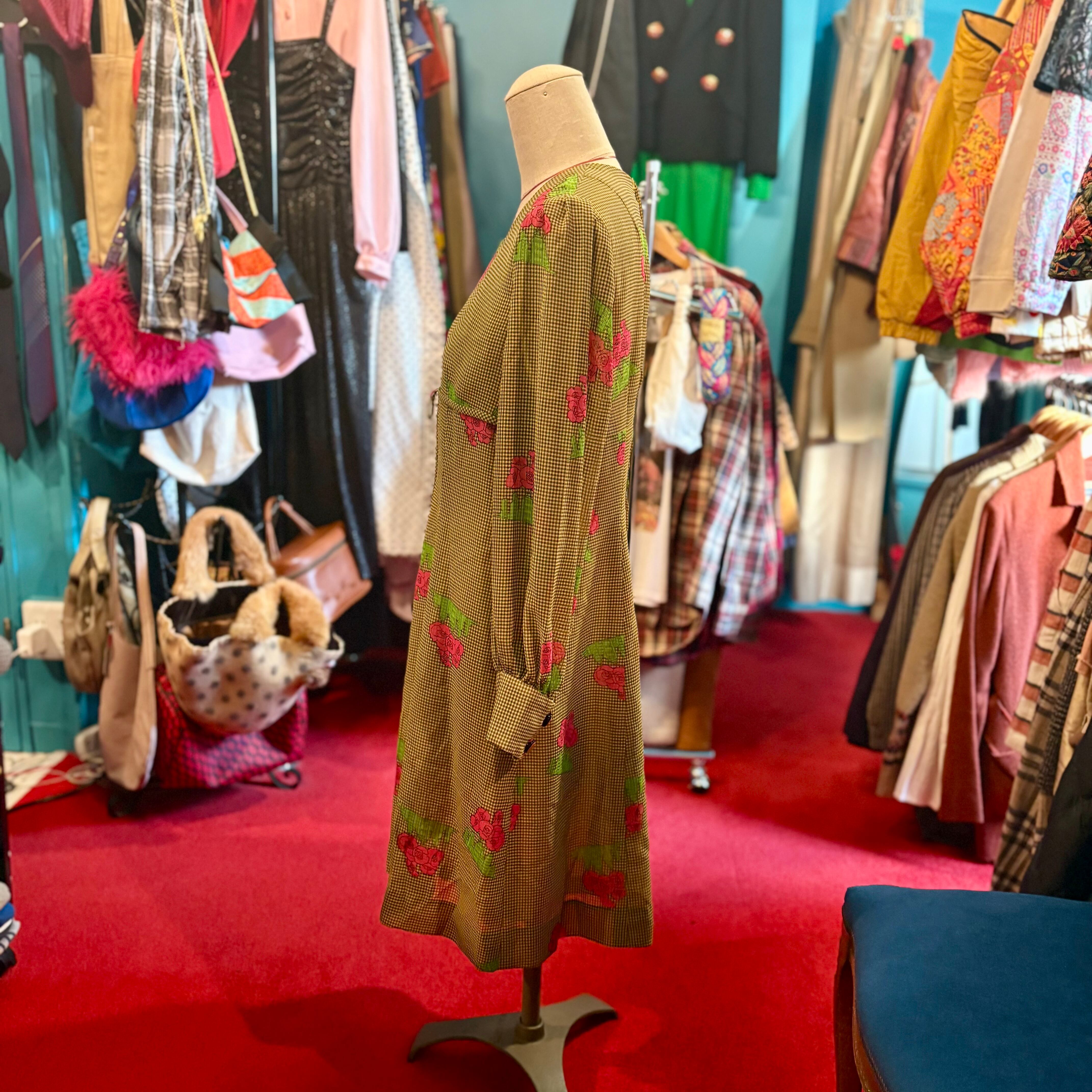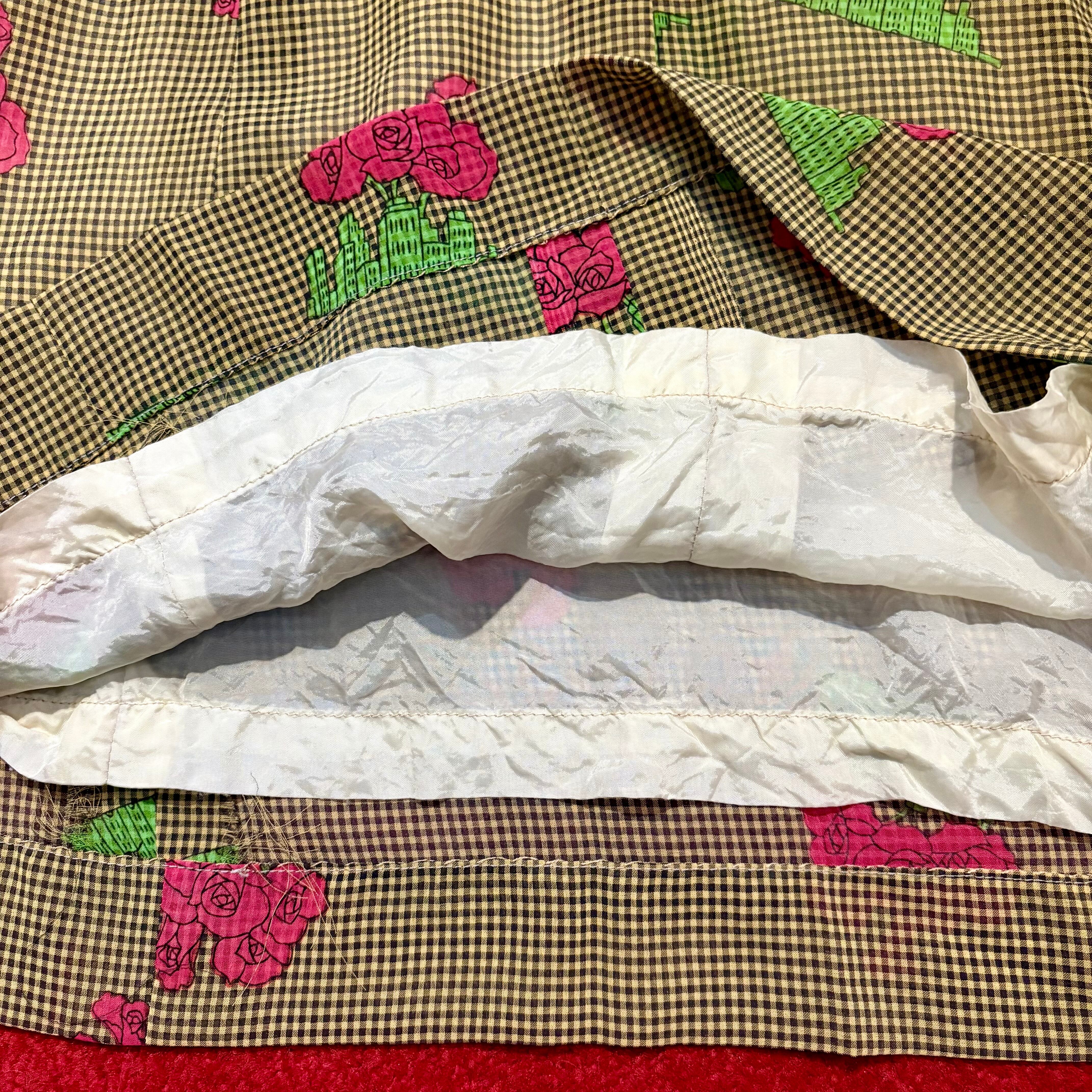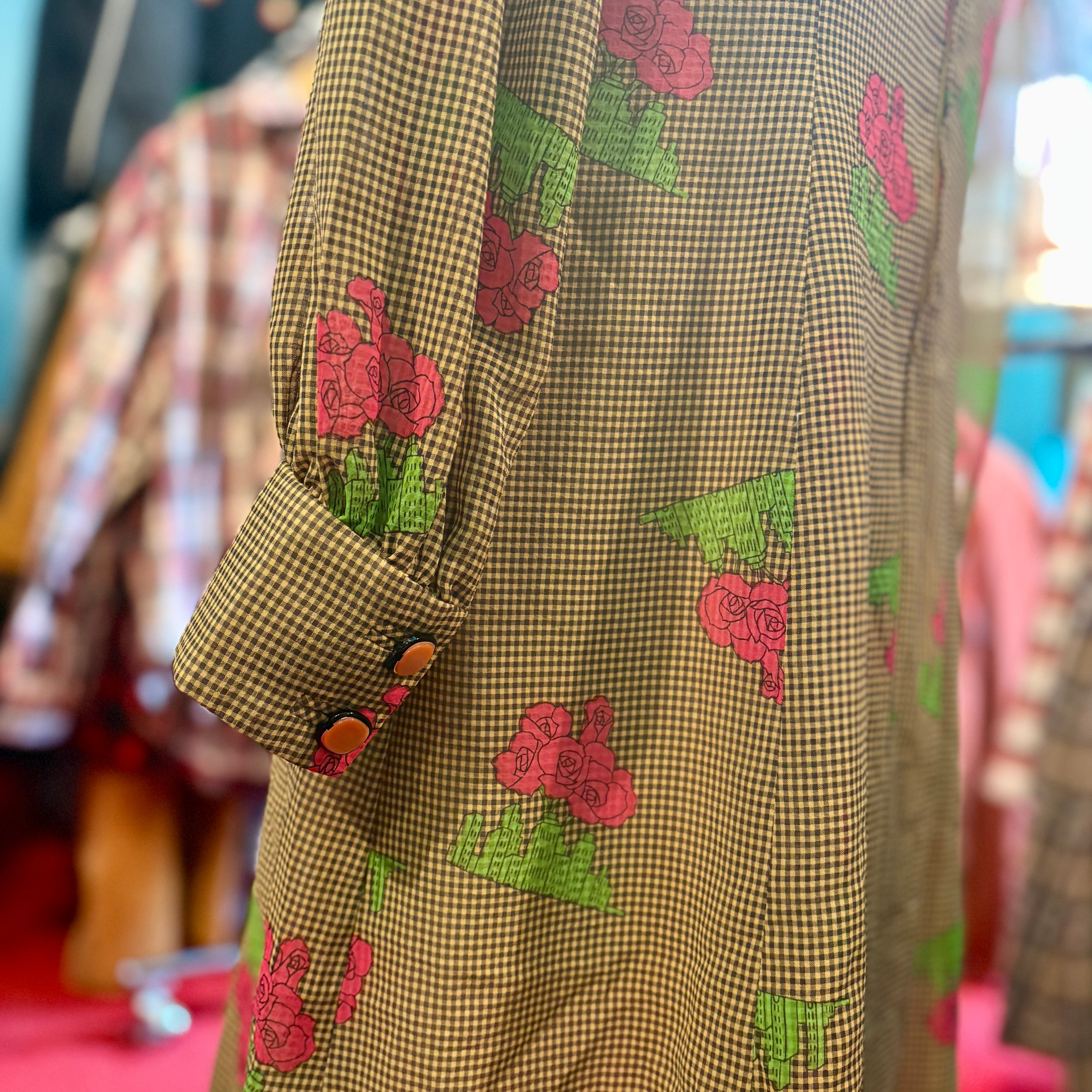 薔薇とビルディング模様の昭和レトロな柄ワンピース ギンガムチェック