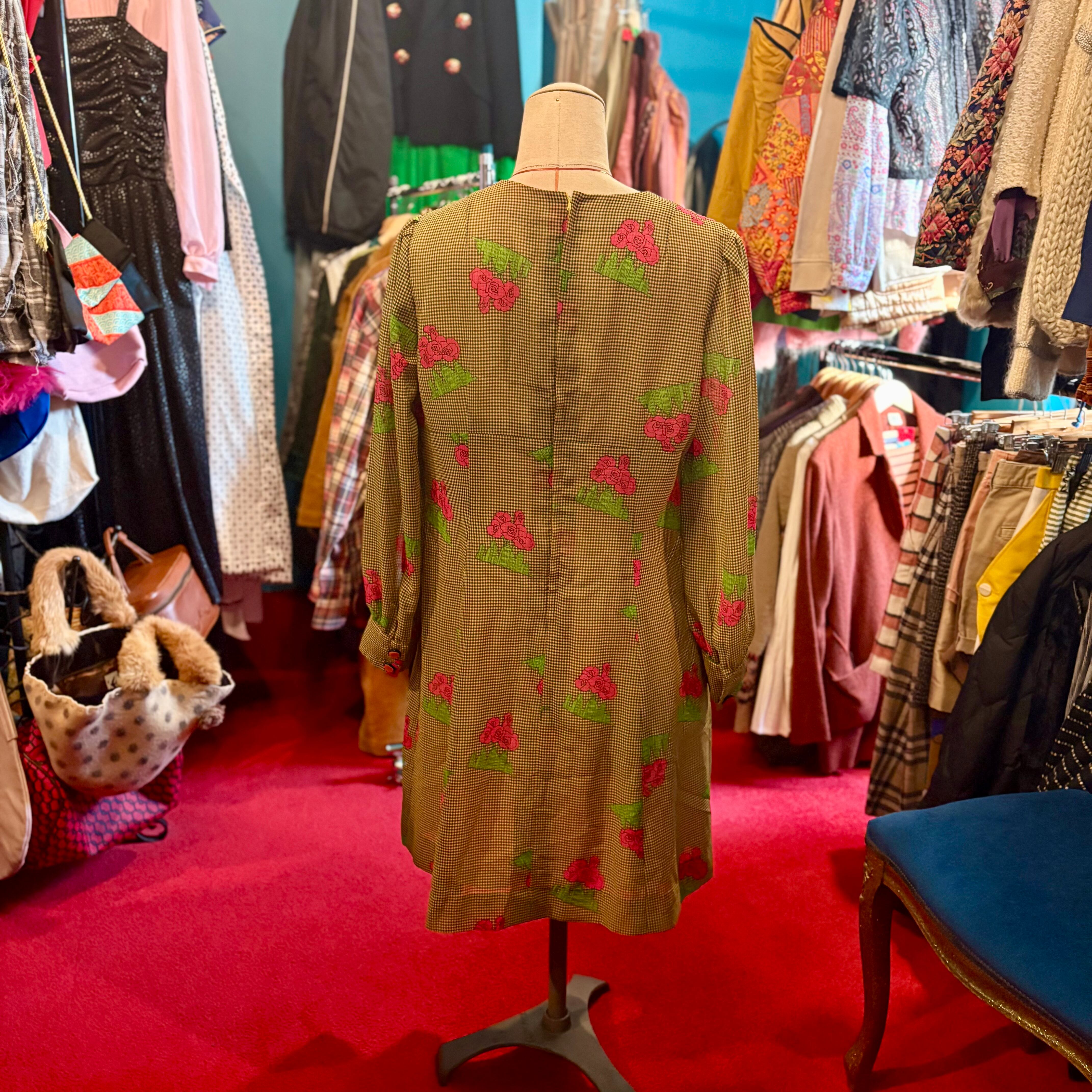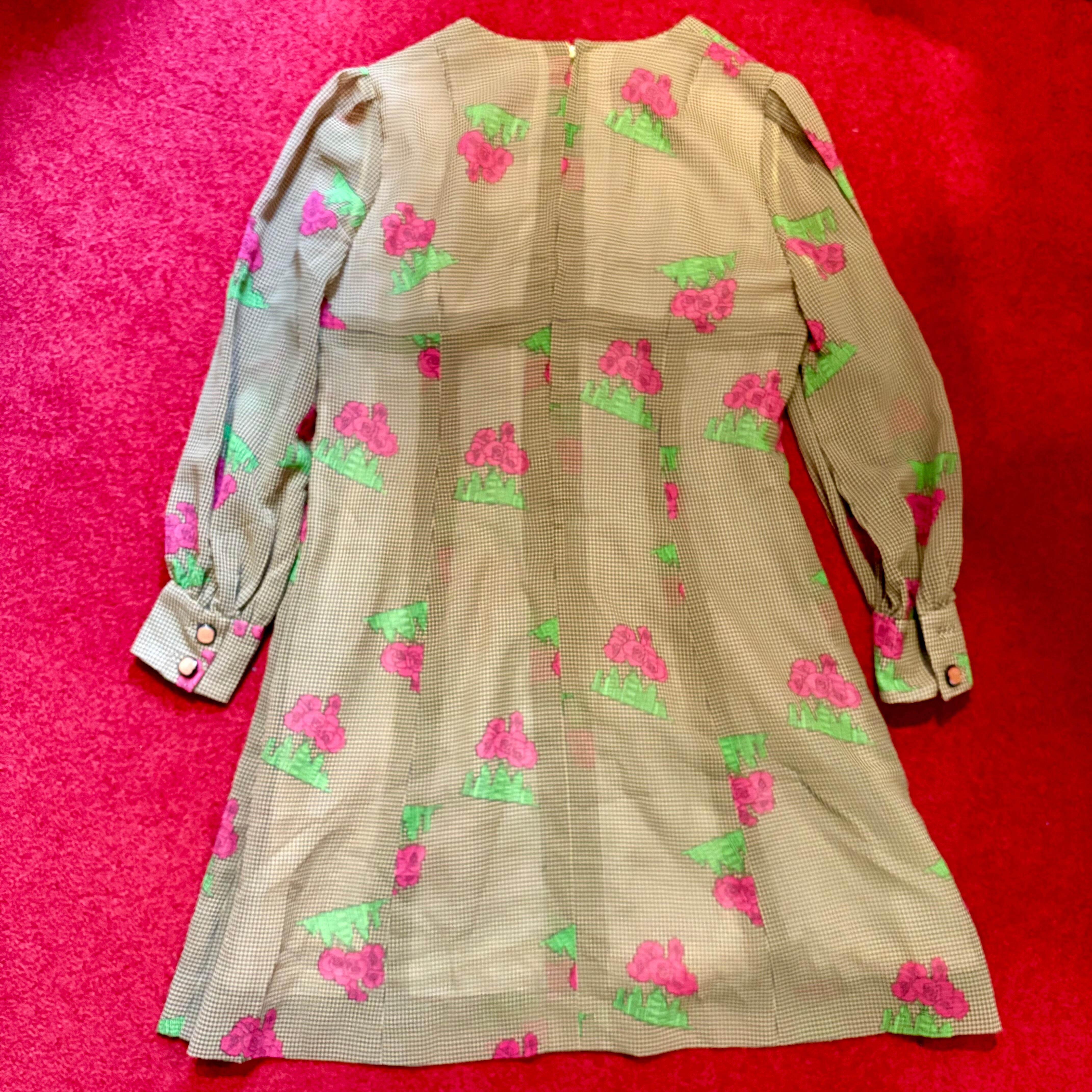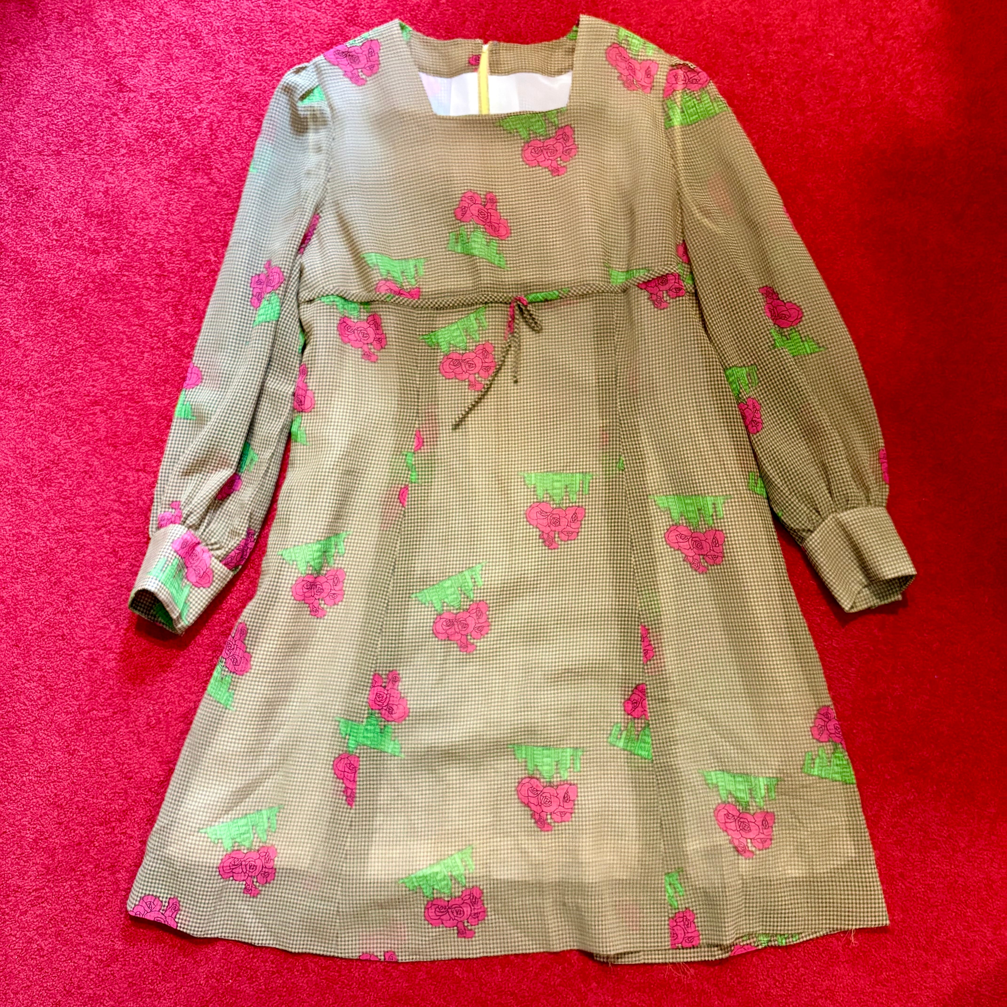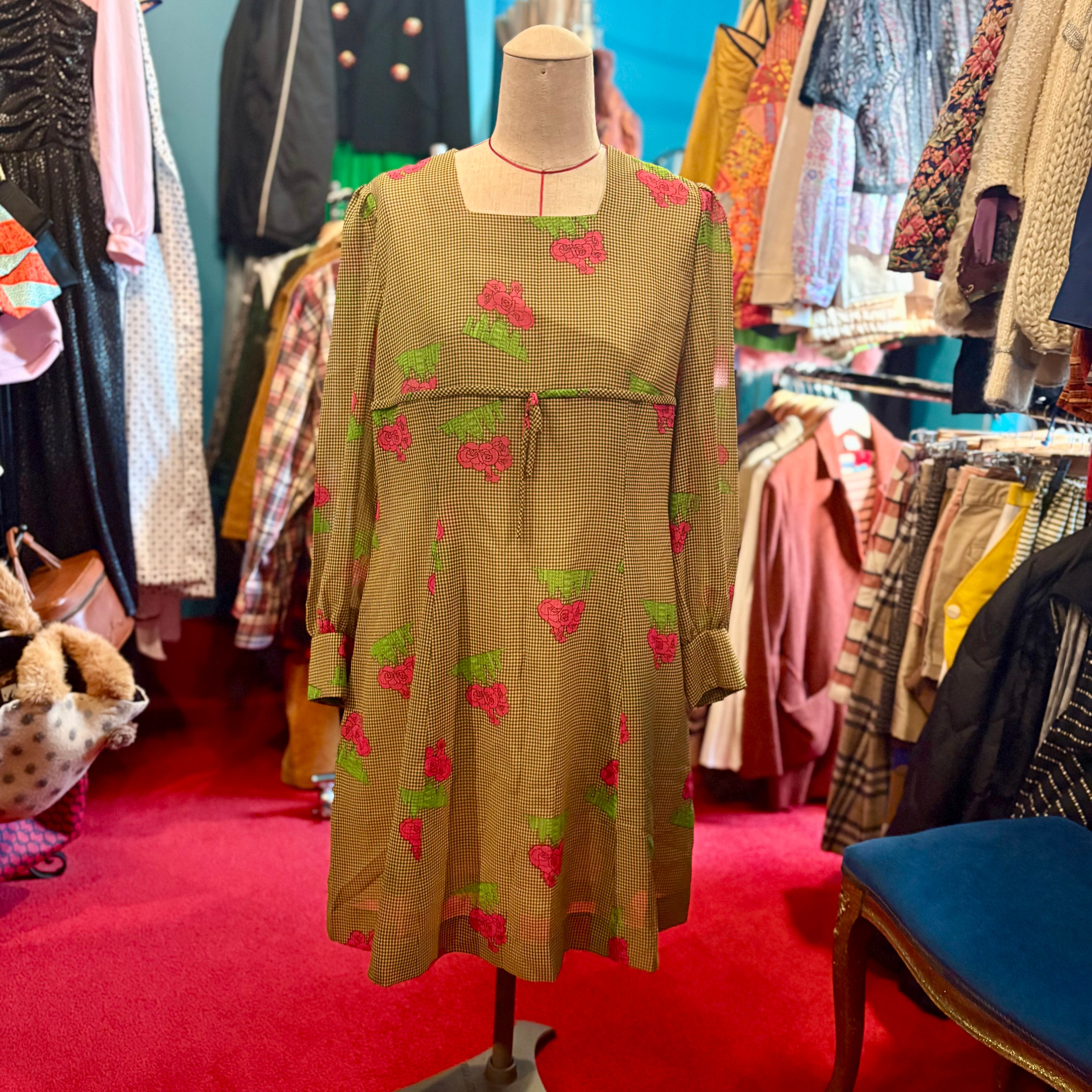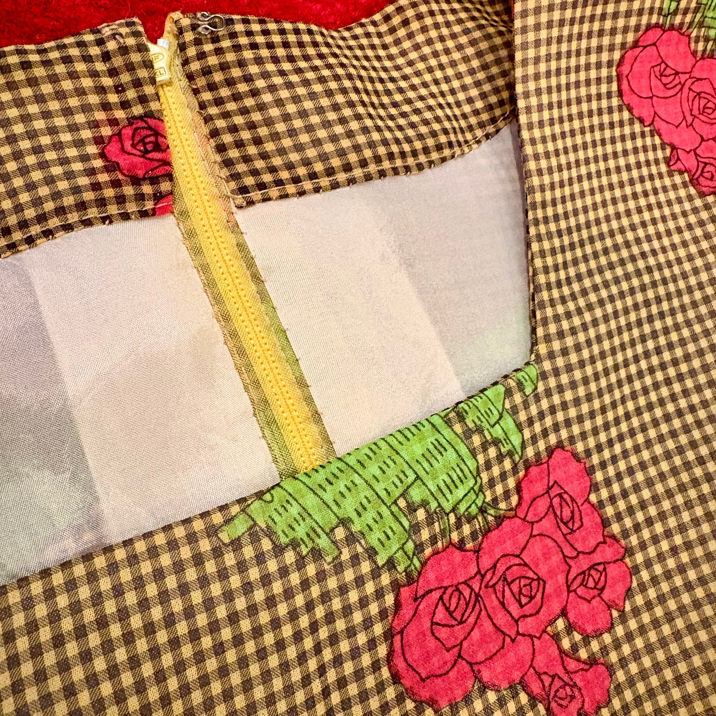 薔薇とビルディング模様の昭和レトロな柄ワンピース ギンガムチェック