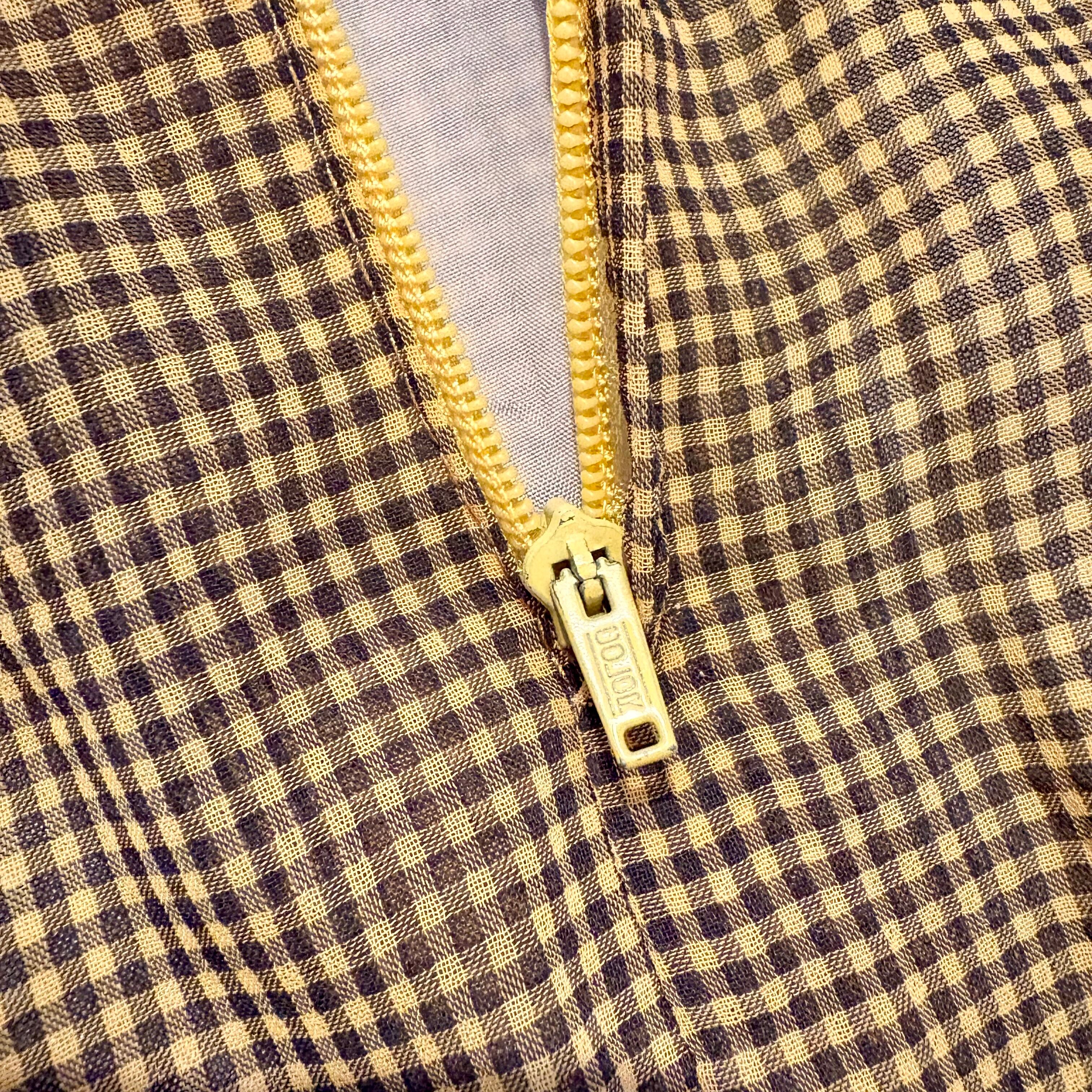 クリームイエローとダークグレーの細かいギンガムチェックの上に、ビル群にバラが咲いている独創的な絵柄が散りばめられた個性派レトロワンピ。