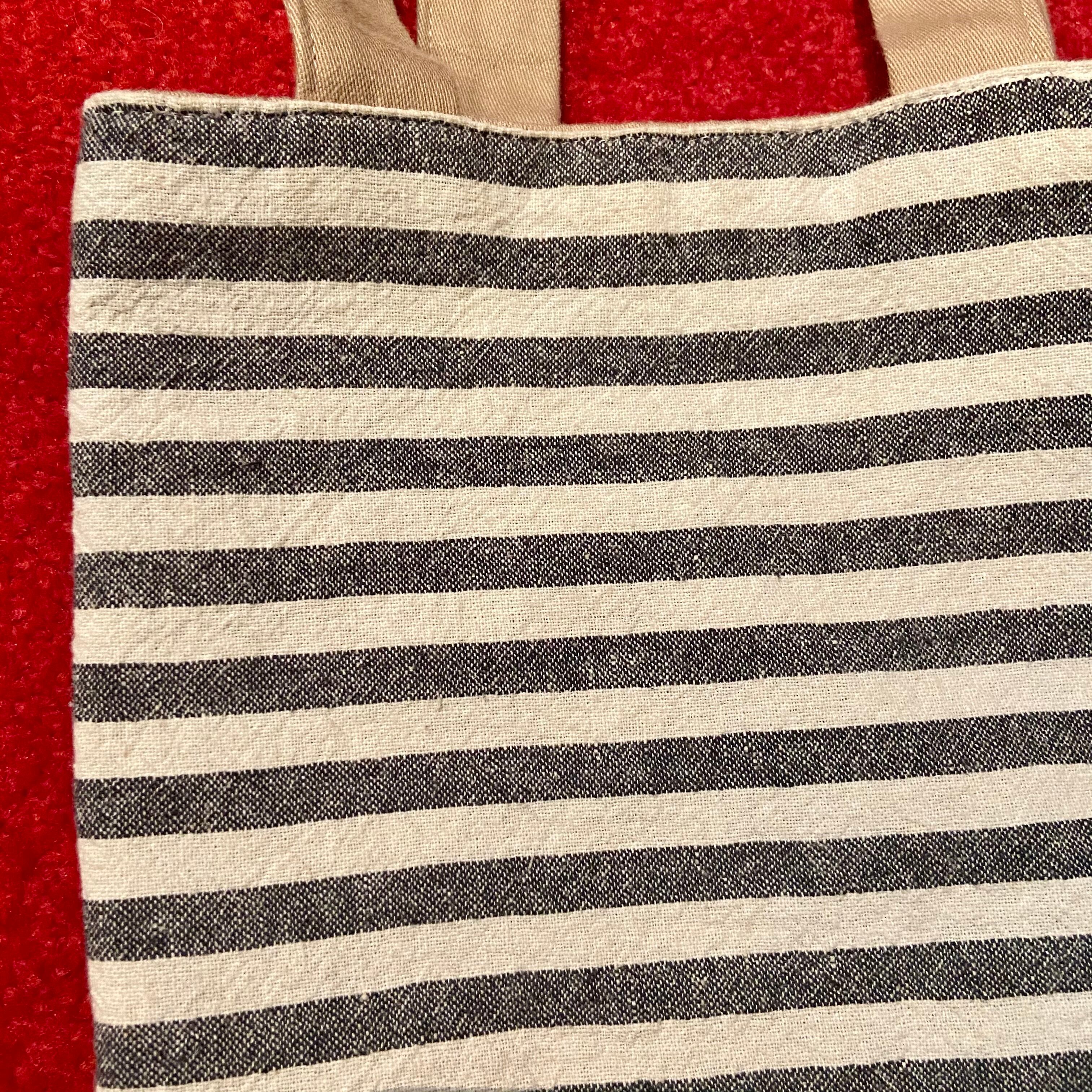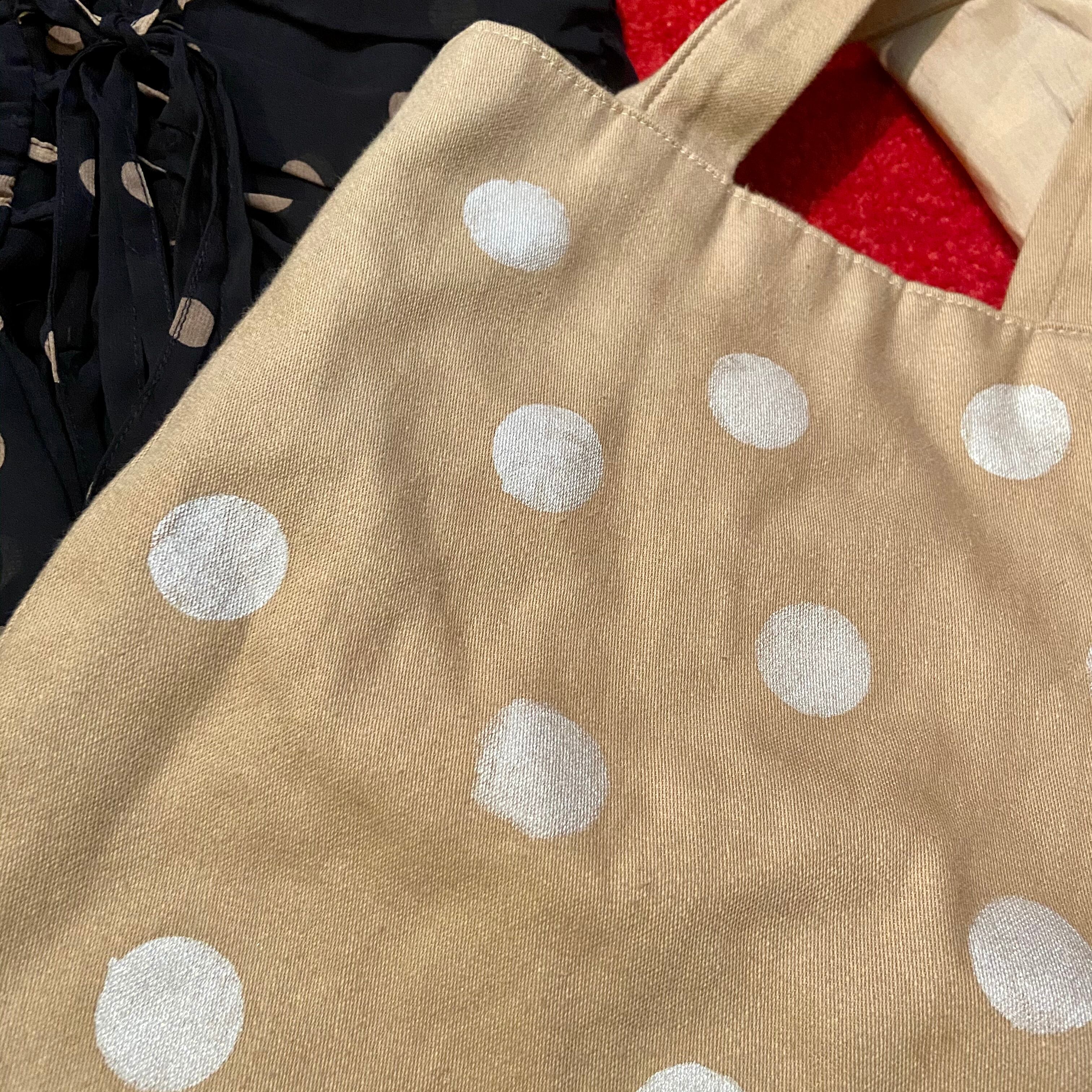 ベージュに白の手描きの水玉(片側のみ)、ざっくりとした質感のグレー×白ボーダーの生地のリバーシブル仕様のハンドメイドバッグです。