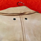 ハードなイメージのレザージャケットもやわらかなベージュでやさしい雰囲気。
