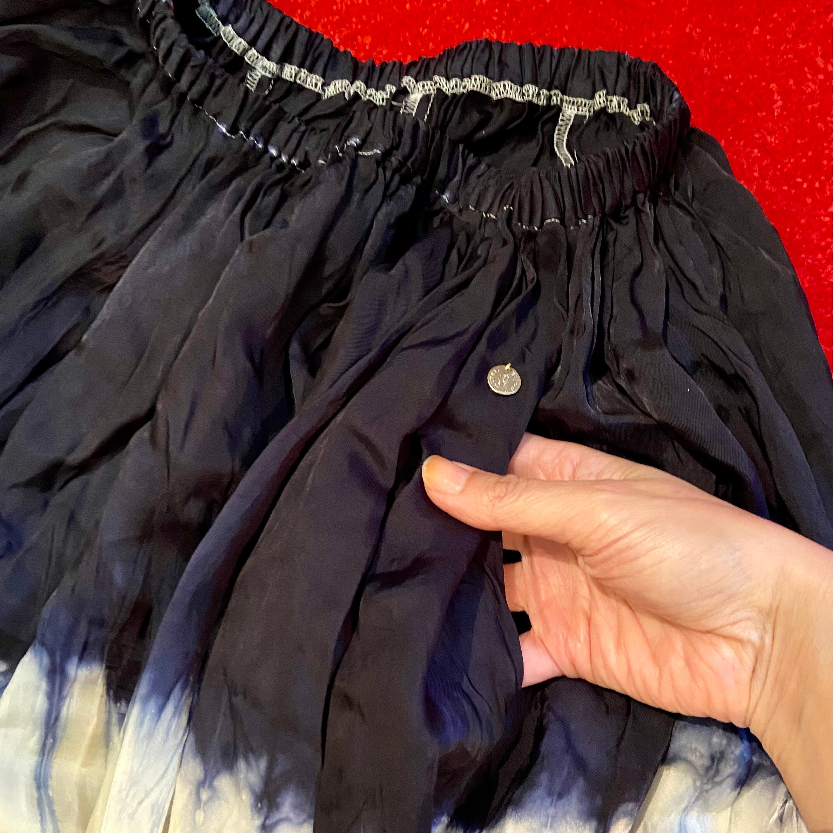 フリーサイズで安心のウエストゴム仕様、たっぷりボリュームのあるギャザー、上品な光沢感のあるキュプラ素材。