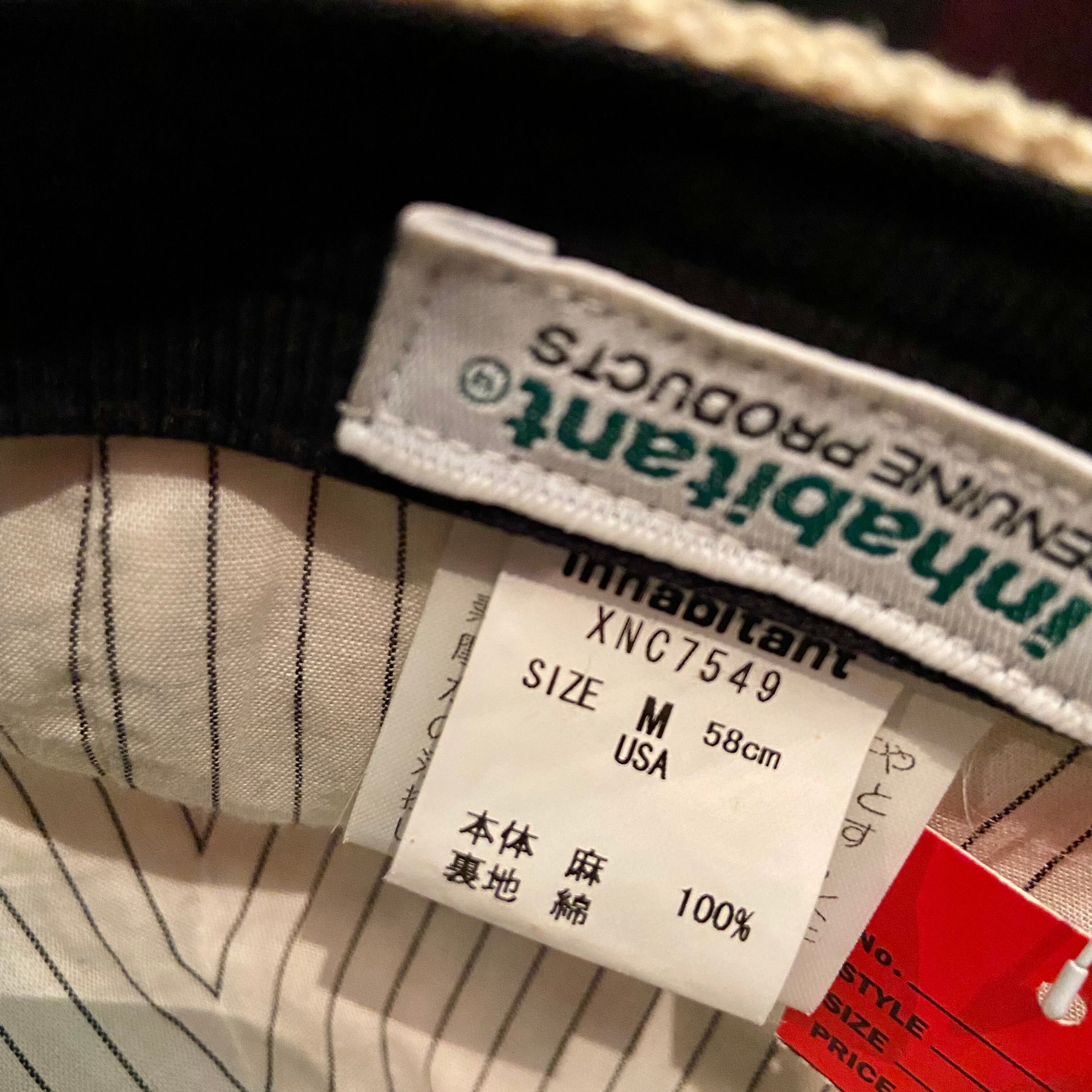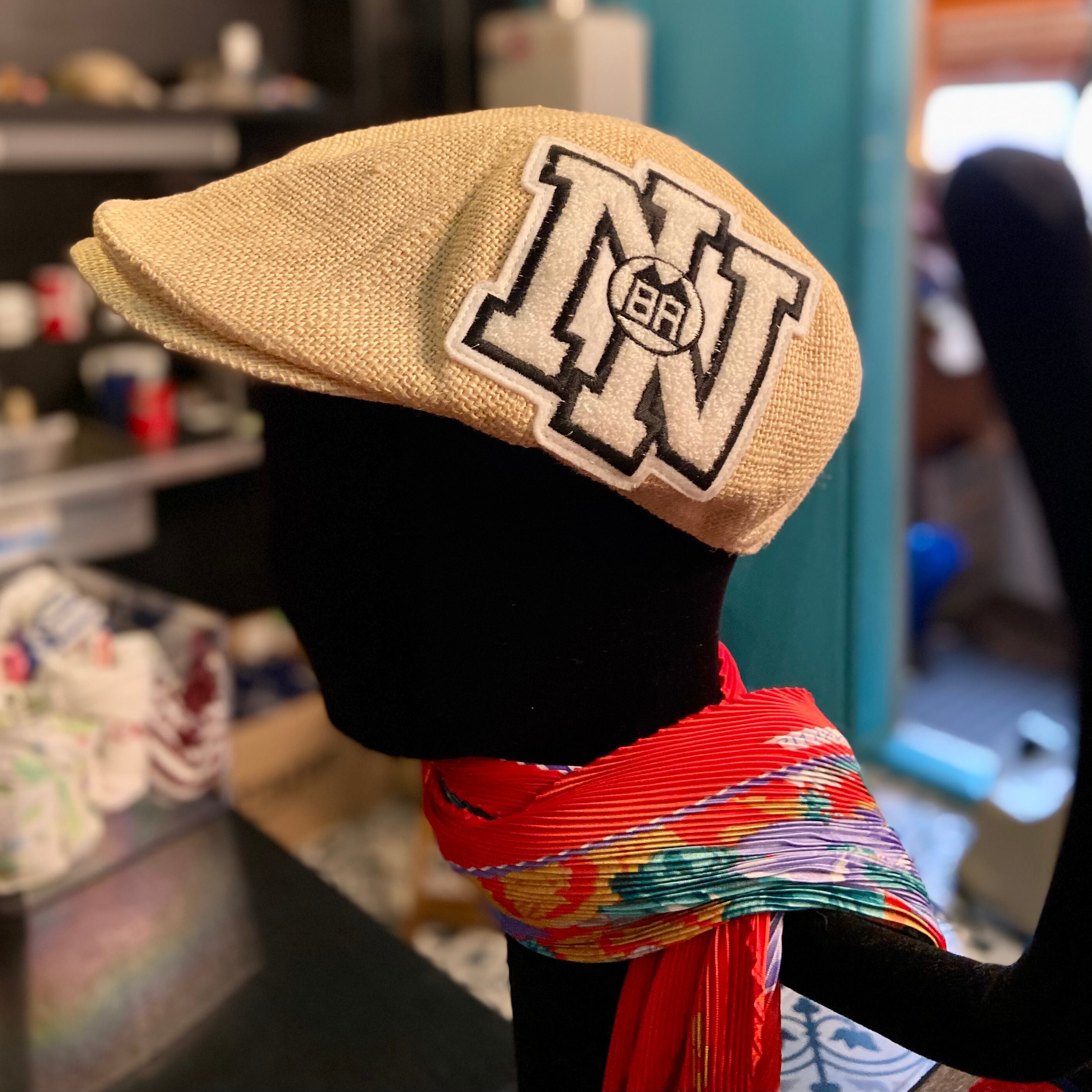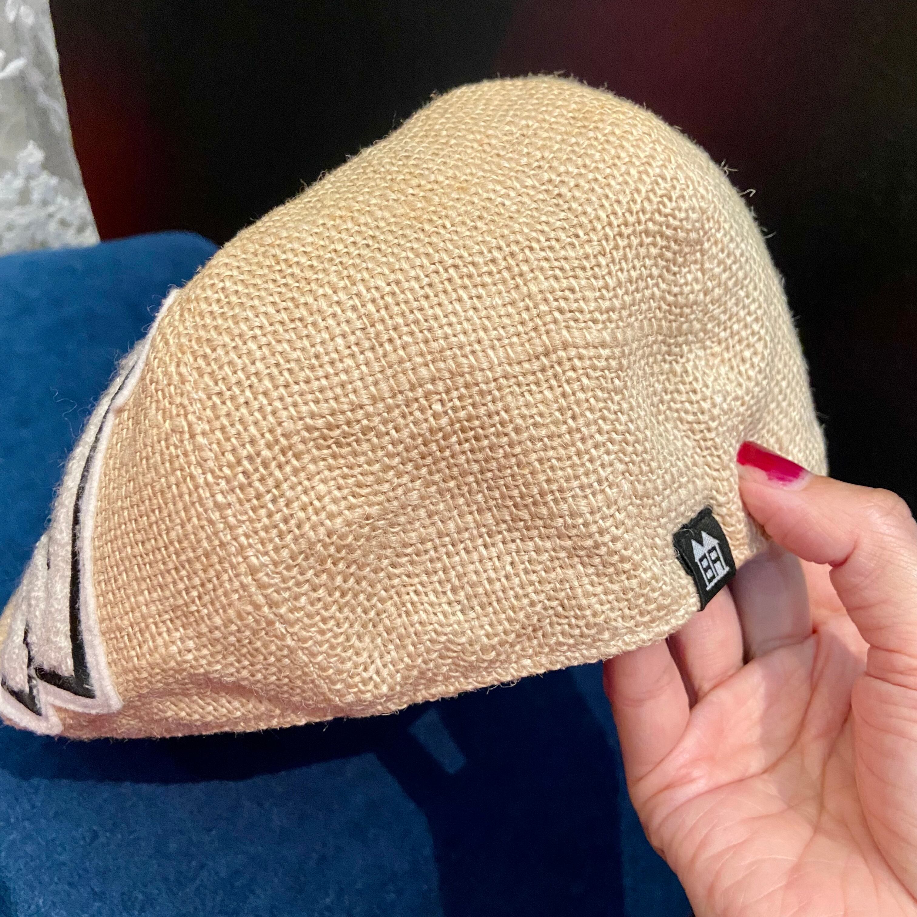 ざっくりとした麻素材、サイドに大きなワッペンの付いためずらしい夏向けハンチング帽。