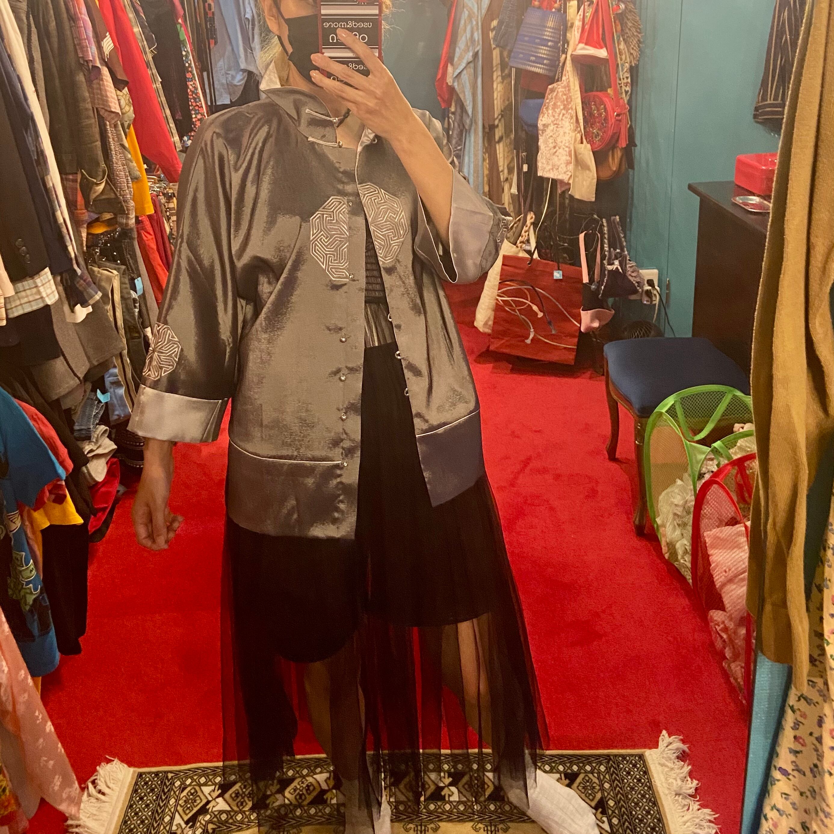 光沢感のあるシルバーのようなグレーのチャイナジャケット。
