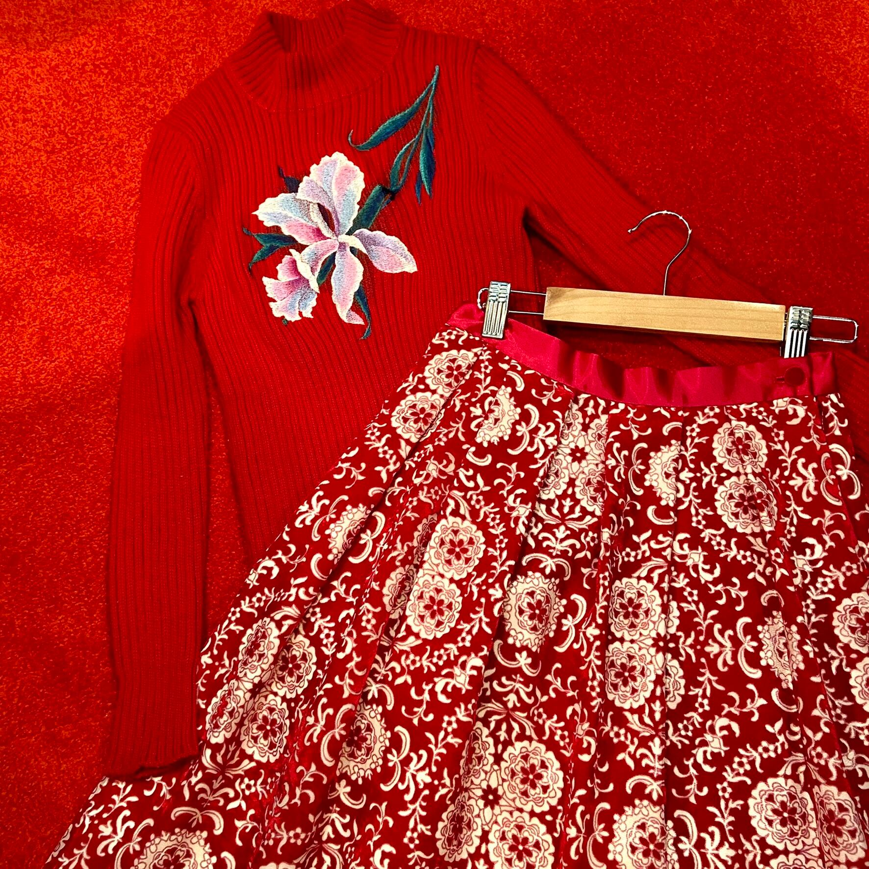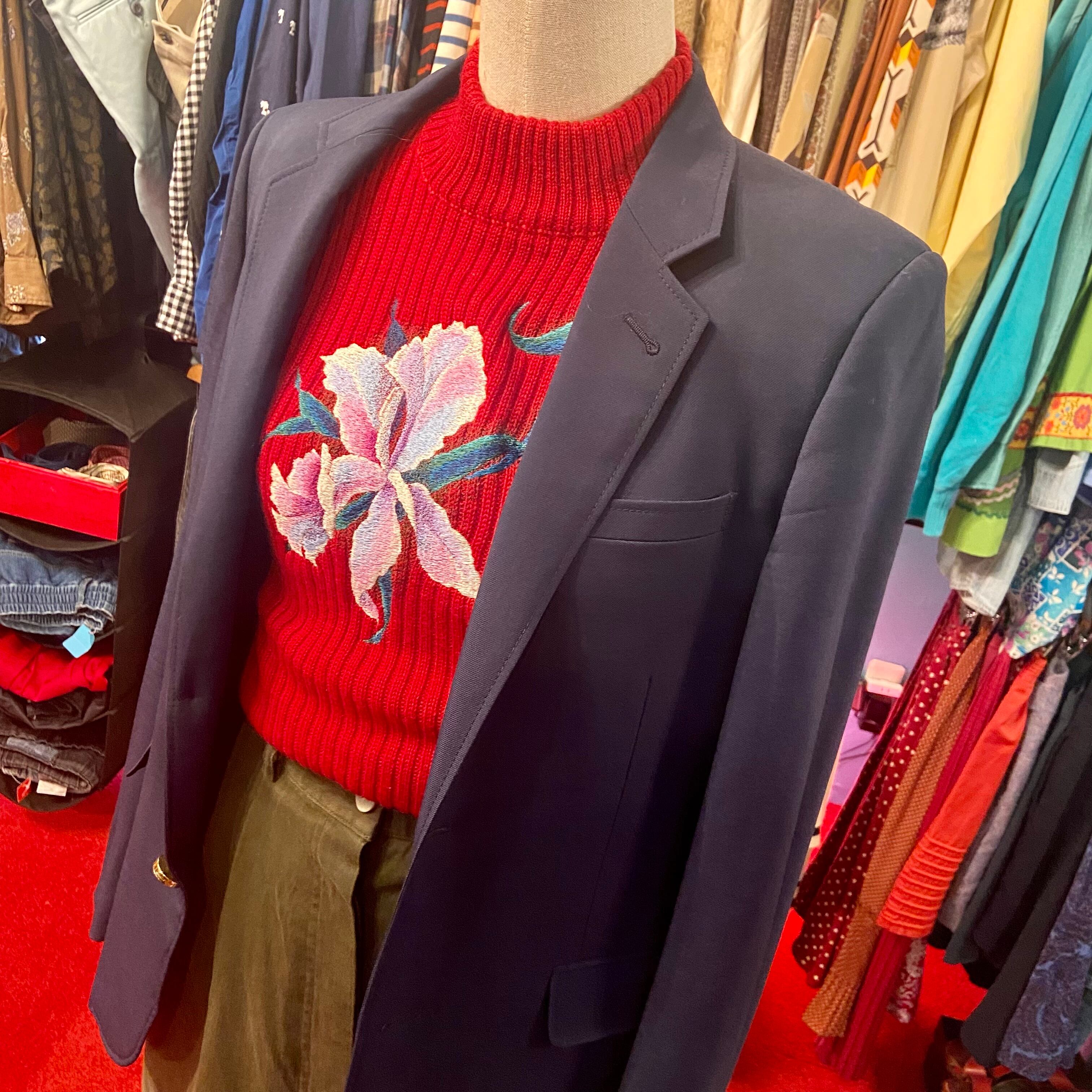 真っ赤なリブニットの前面に大きなお花の刺繍が唯一無二な存在感のセーターです。