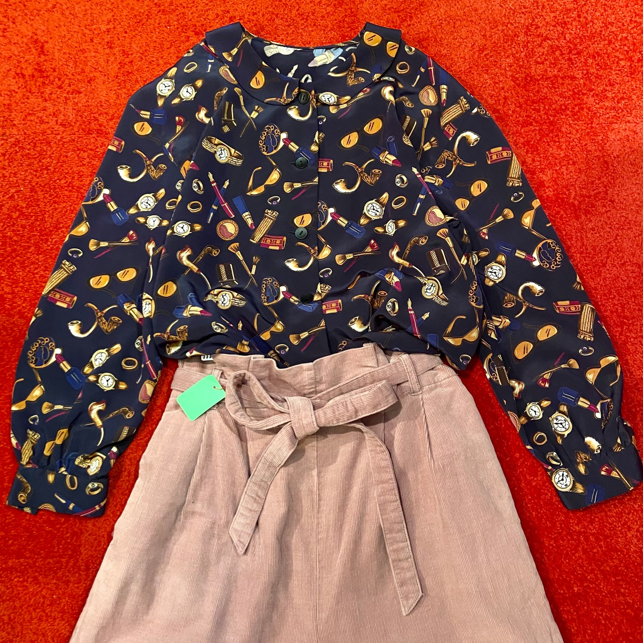 色々な道具が散りばめられた なかなか見かけないめずらしい柄が古着ならでは。