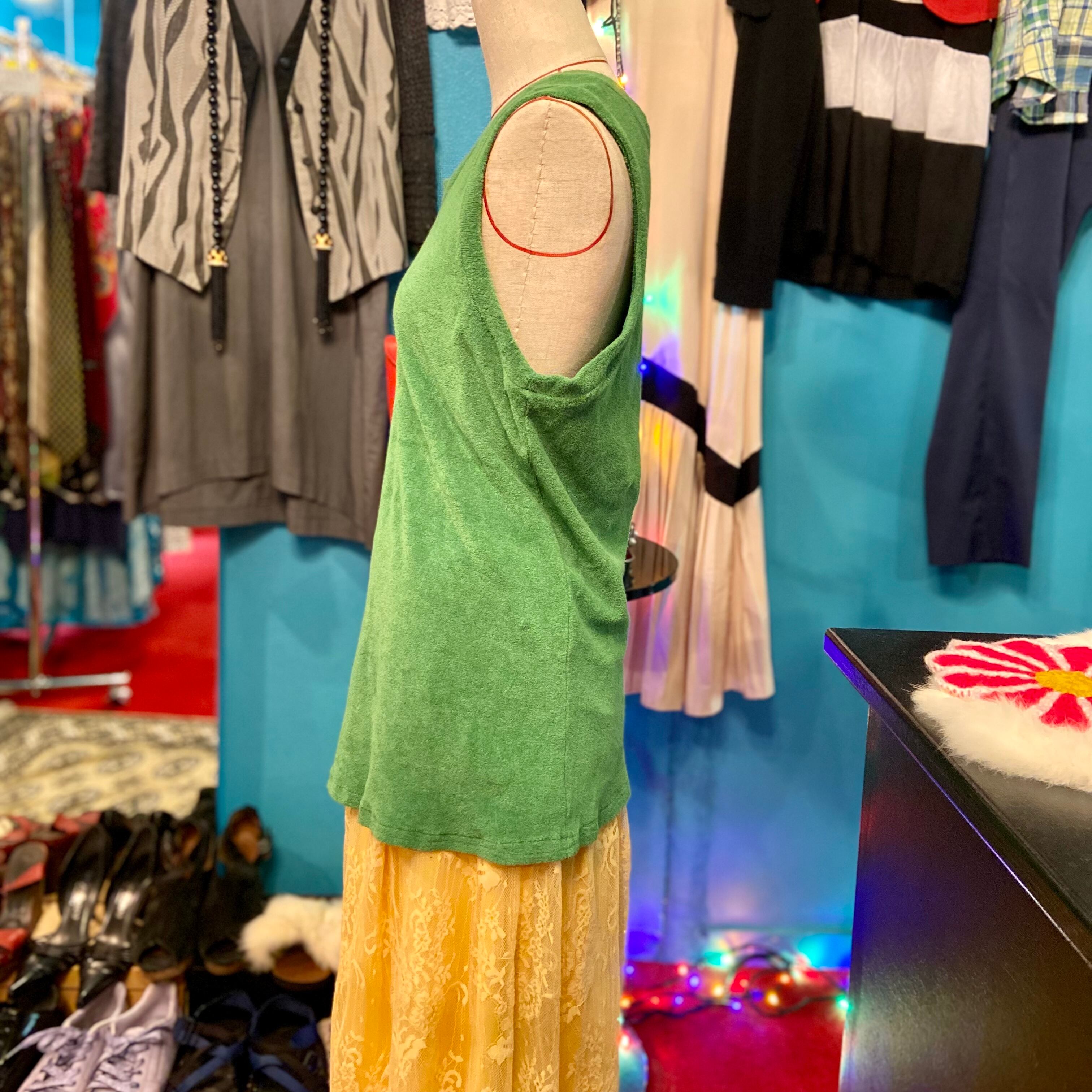 芝生のようなきれいなグリーンのタオル生地。。視覚的にも触覚的にも癒されるタンクトップです。