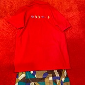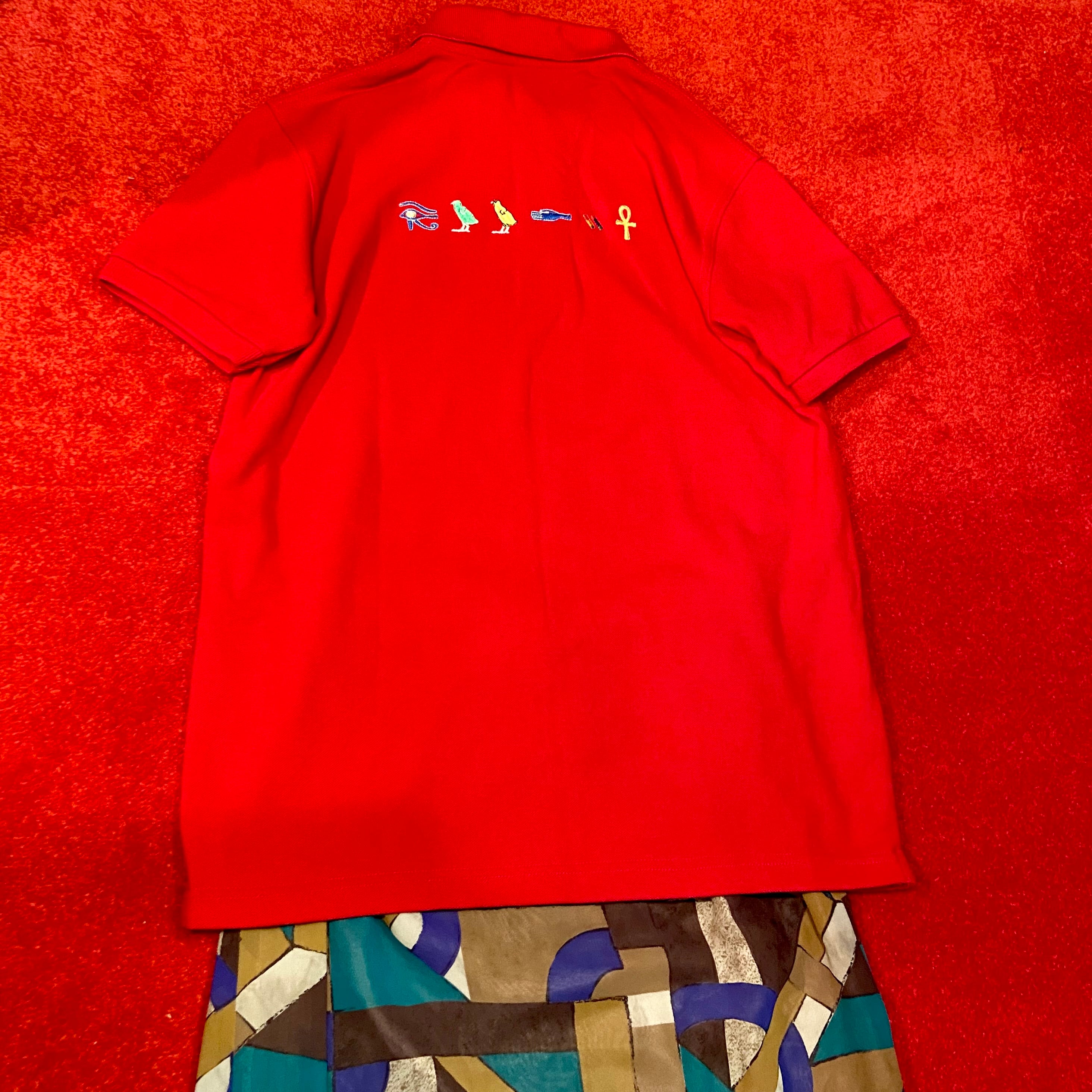 古代エジプトの壁画のようなミステリアスな刺繍が前後に施された真っ赤なポロシャツ。