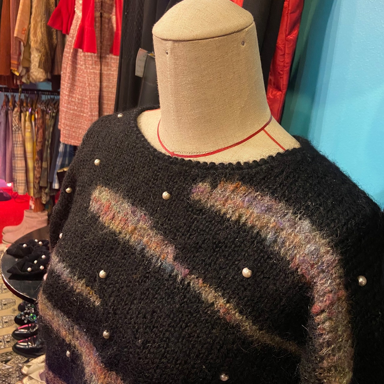 黒にニュアンスカラーの毛足の長いミックス糸、パールが散らばった素敵な夜空のようなストーリー性のあるニットです。