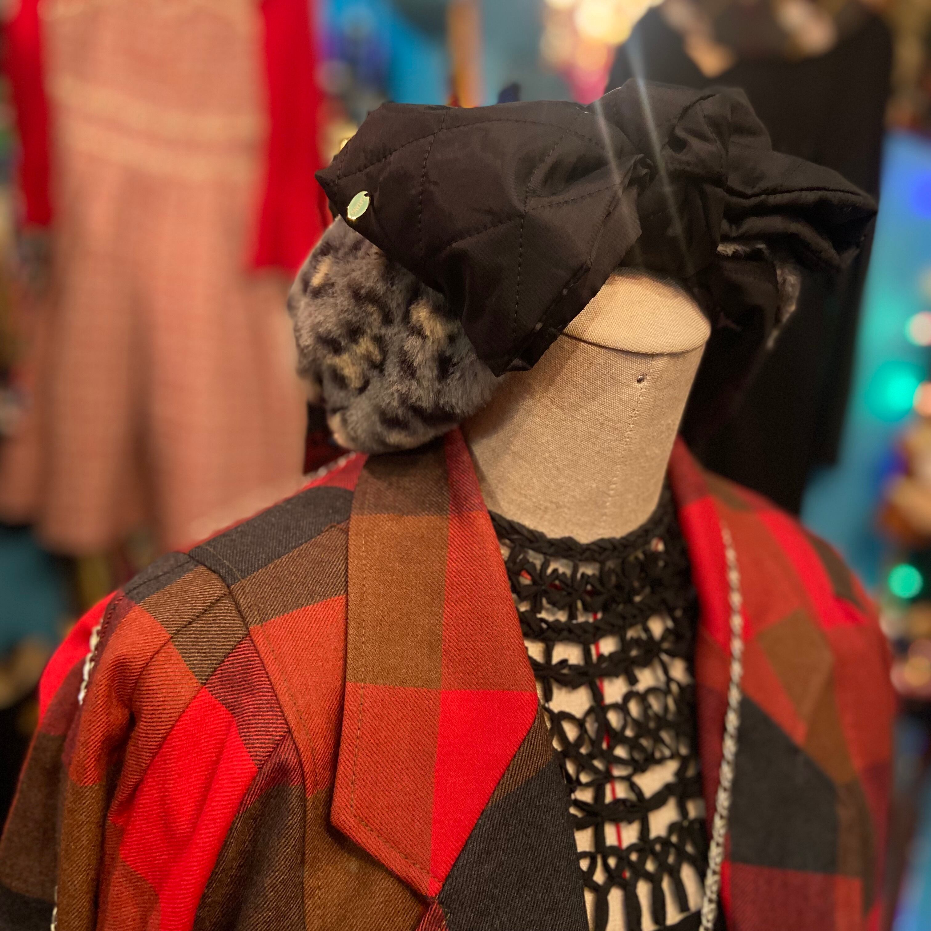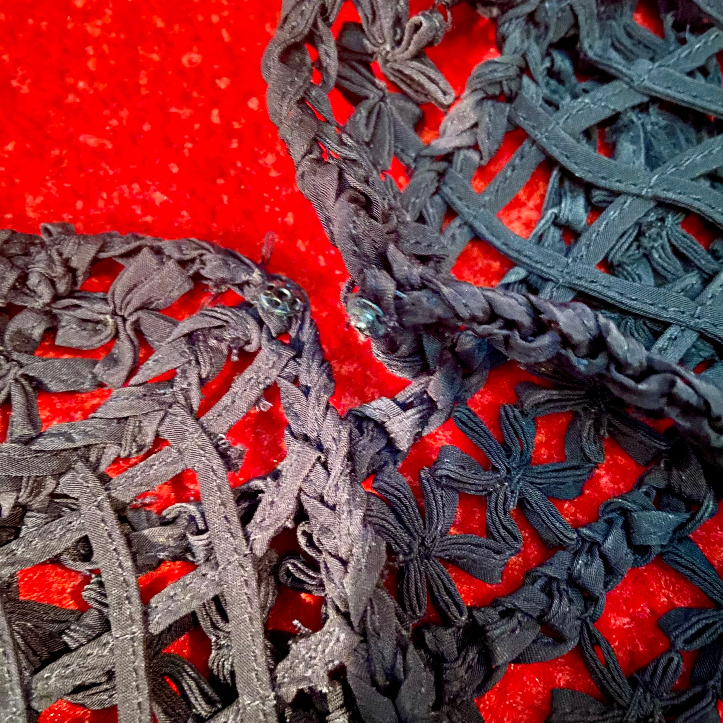 細いリボン紐状にした布を編み、繋ぎ合わせた非常に凝った作りとなっています。