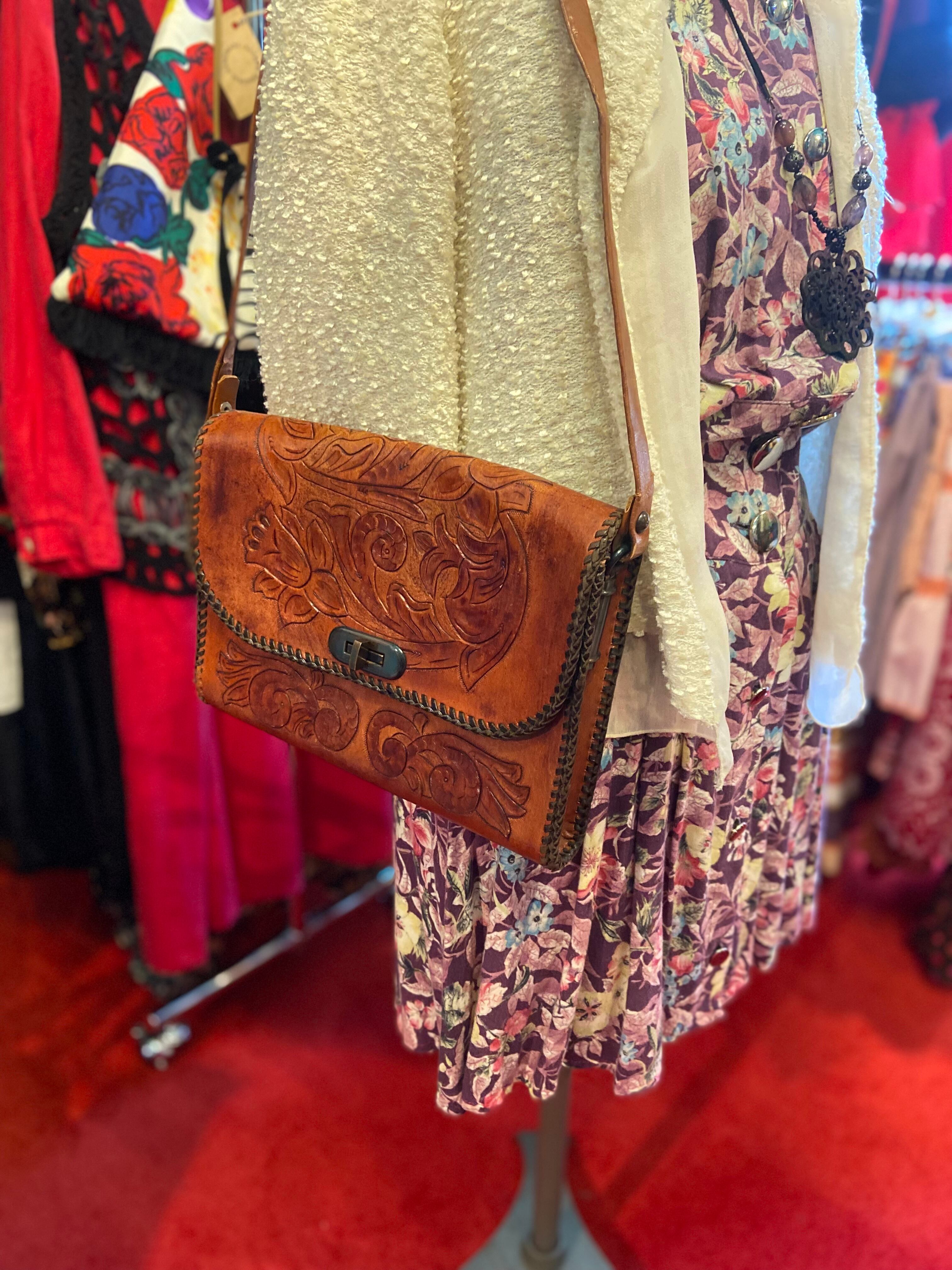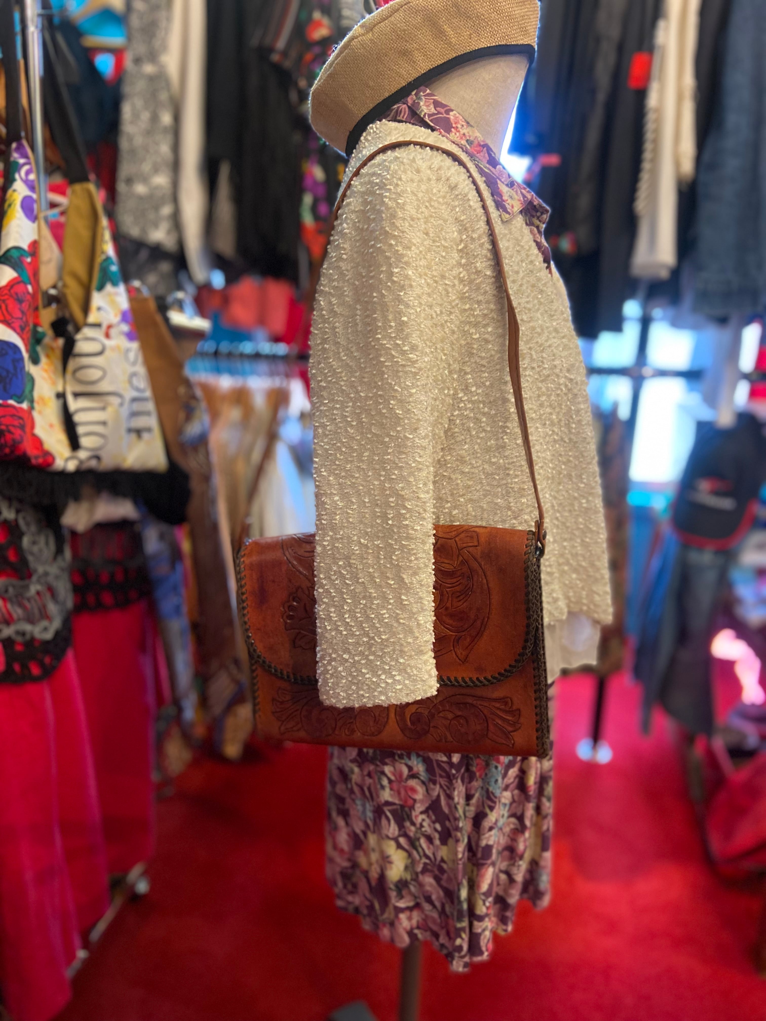 美しいカービング加工が施されたレザーバッグ。