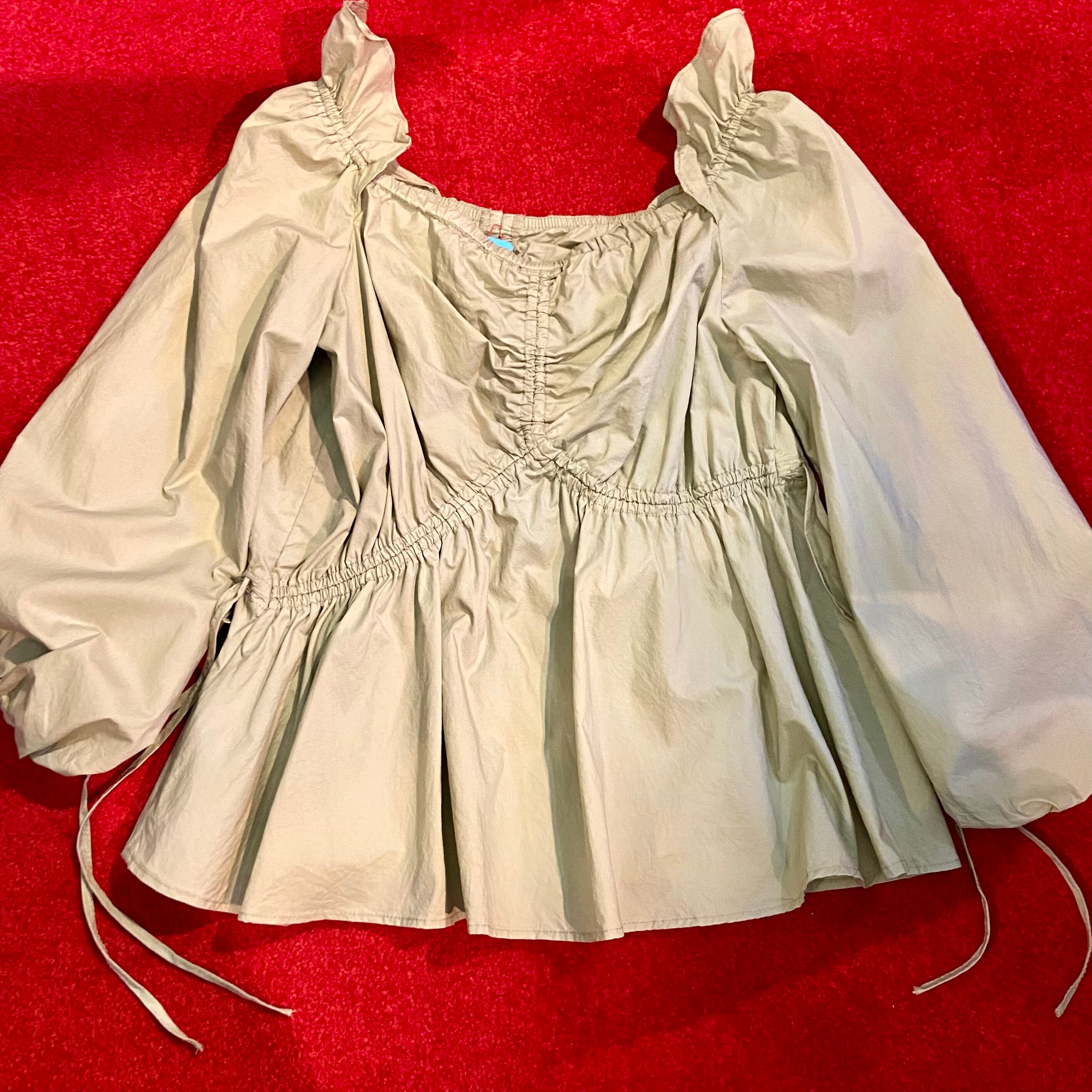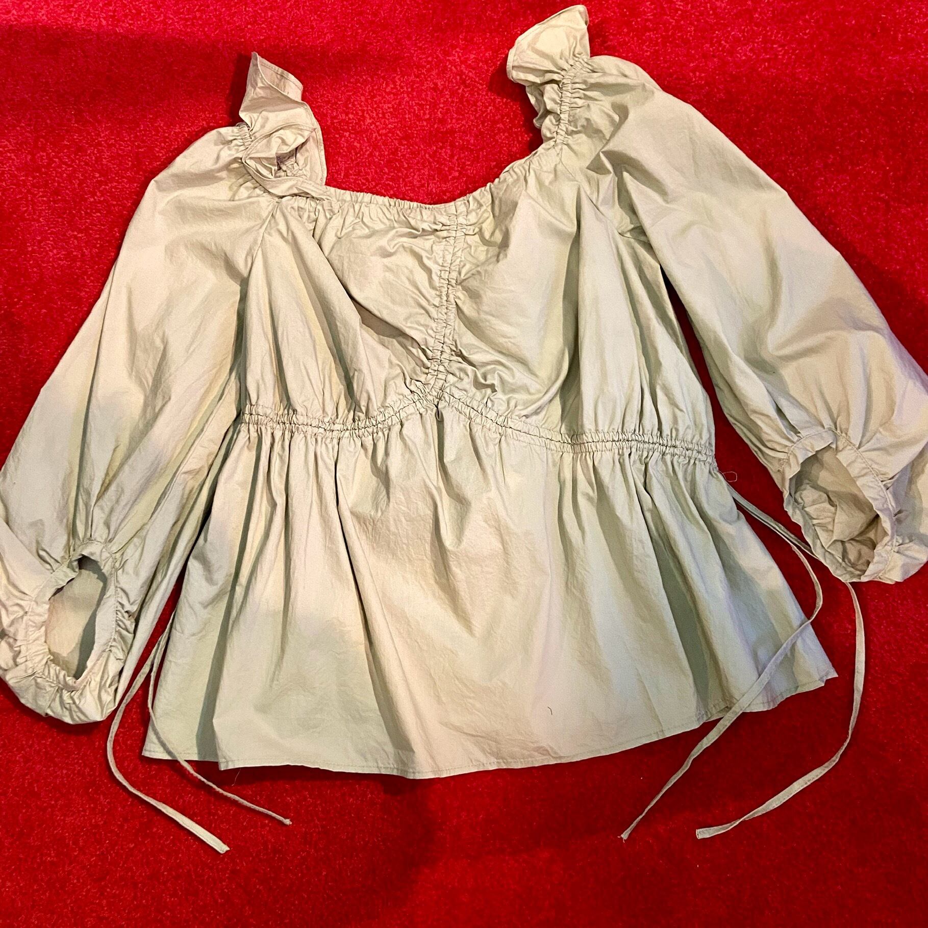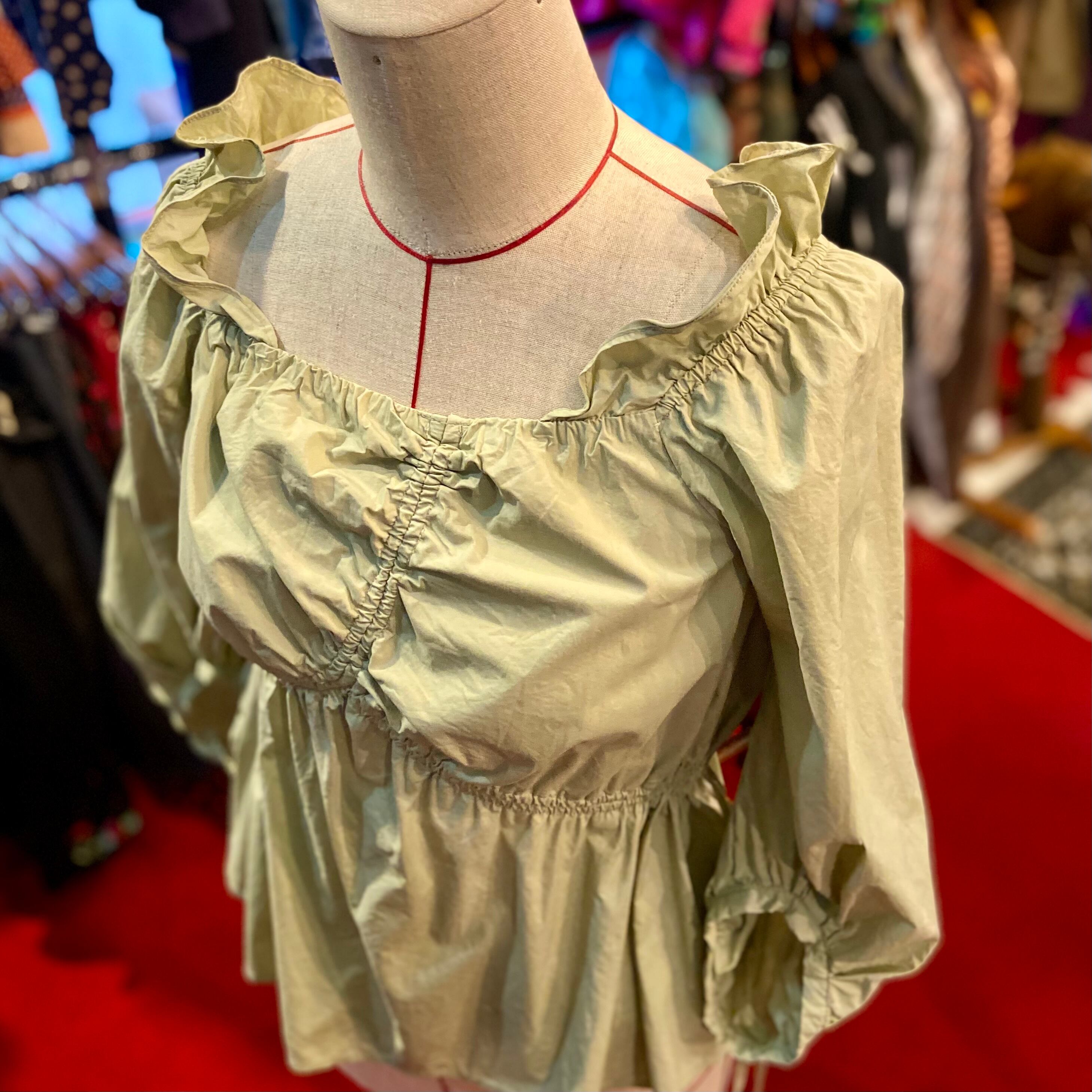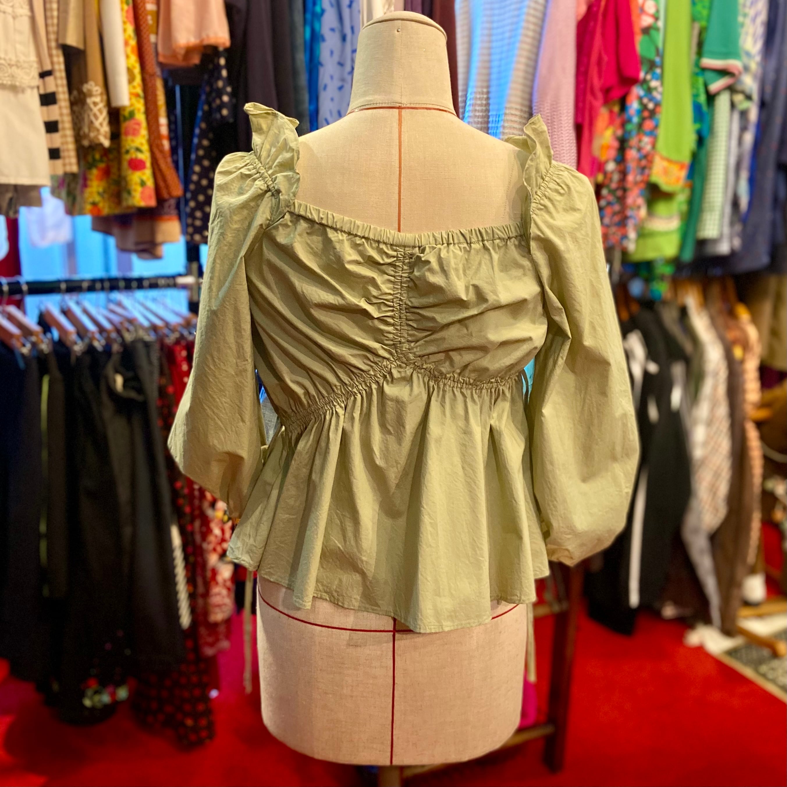 ギャザーに立体的なパフスリーブな七分袖などデザイン性の高いブラウス。