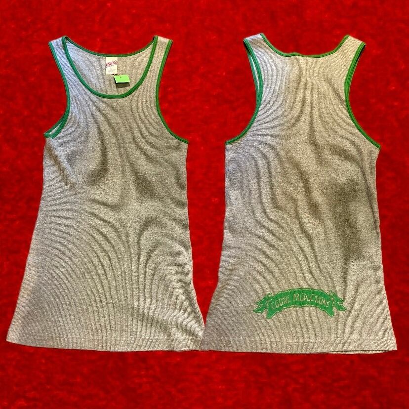 グレーに明るいグリーンのパイピング、後ろ裾にロゴプリントが入ったタンクトップ。