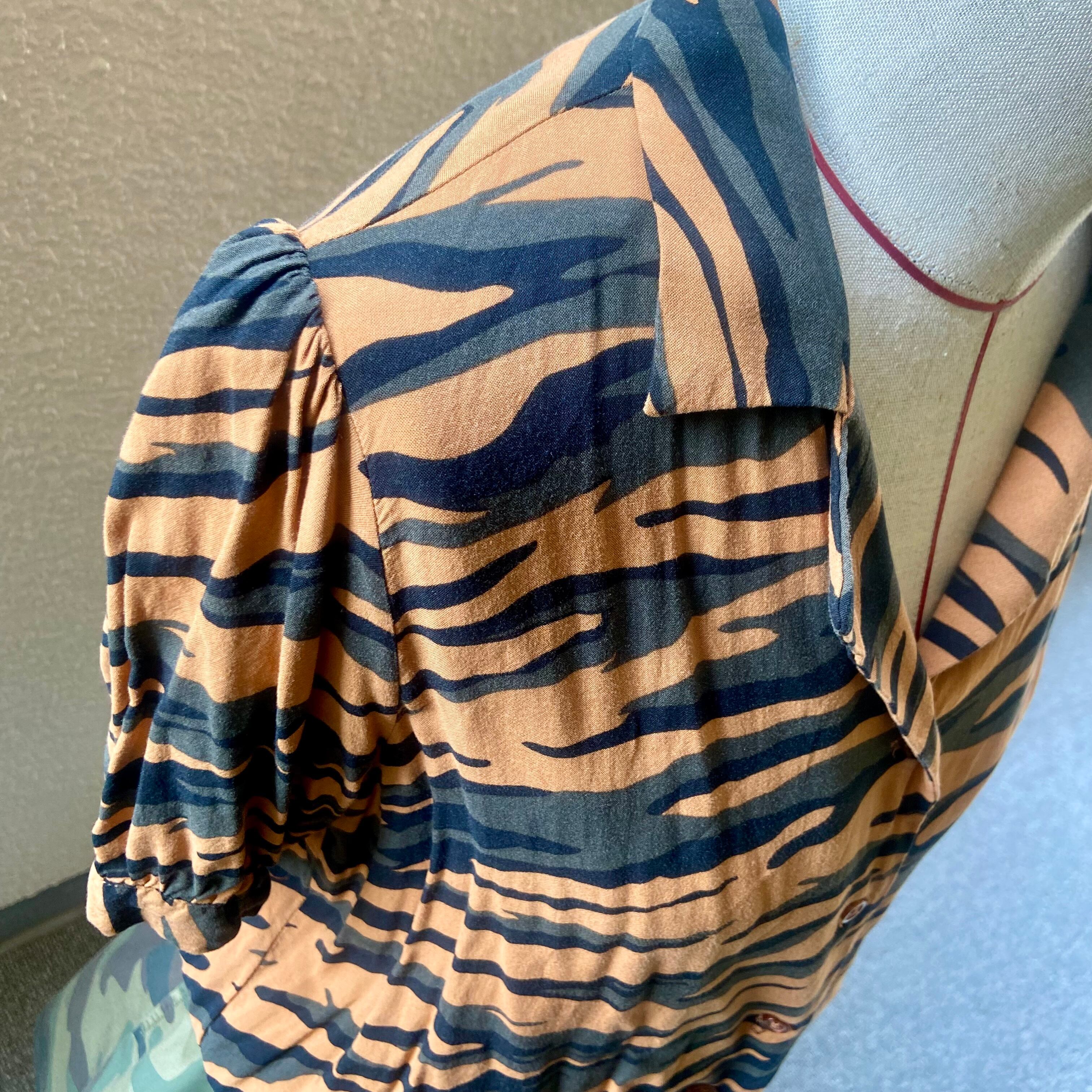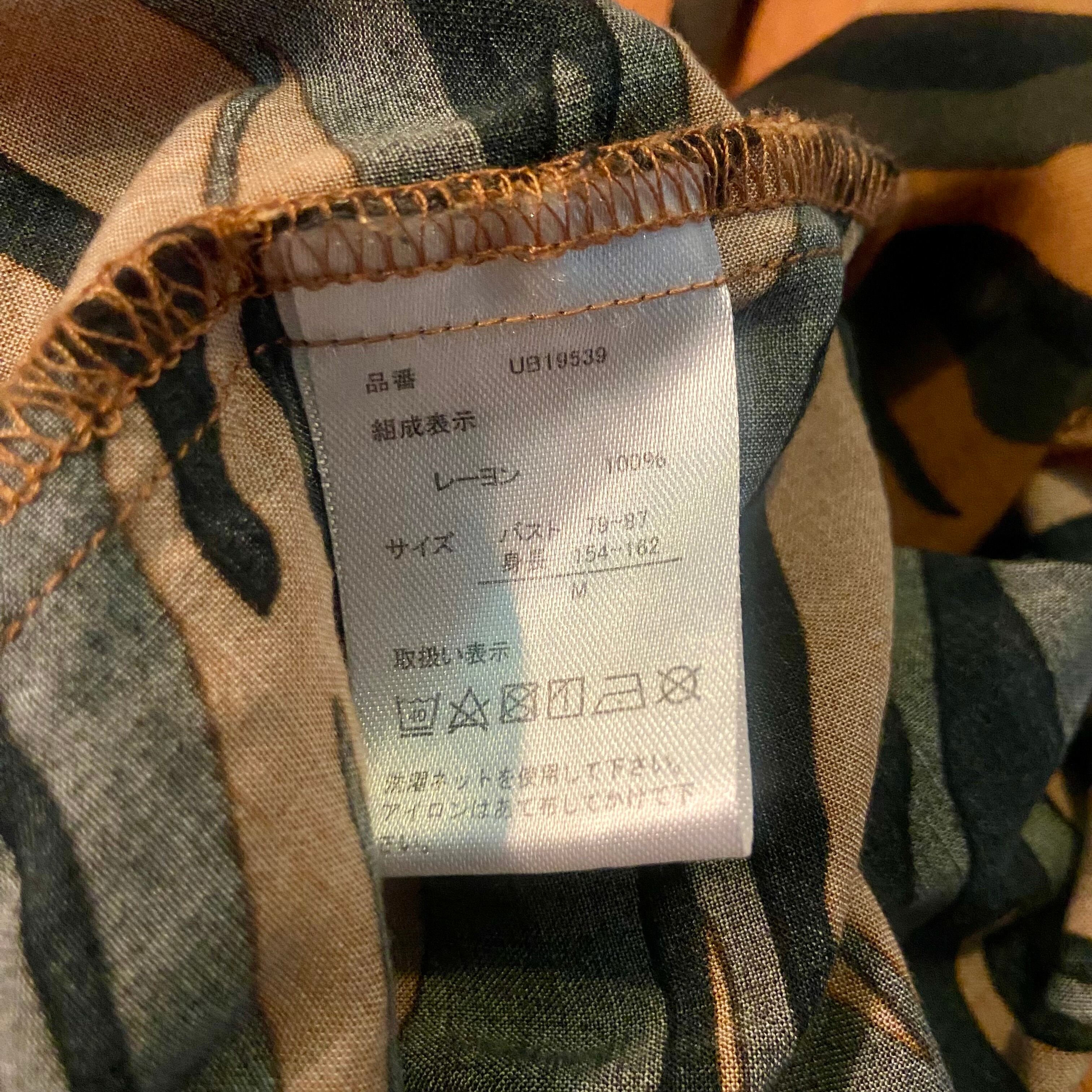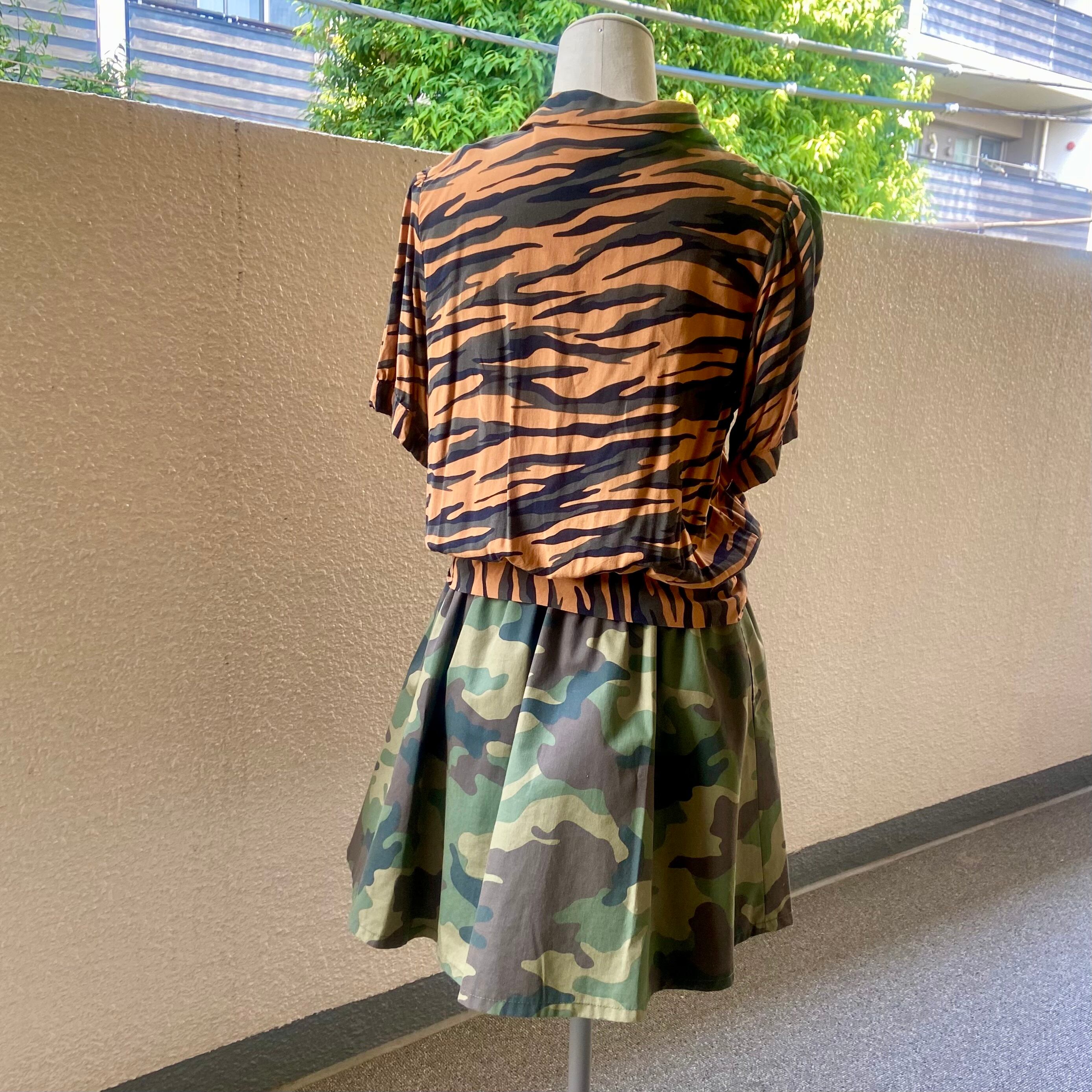 アニマル柄のようにも見える迷彩柄のシャツブラウス。