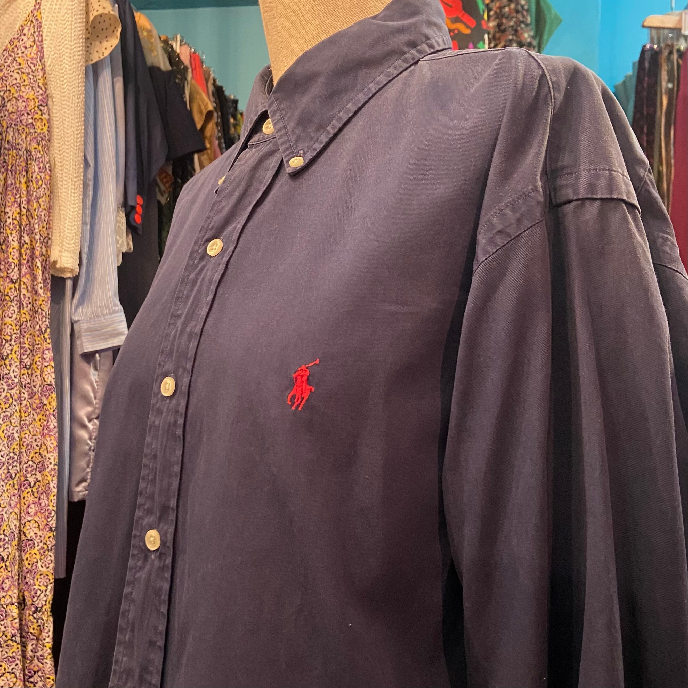 ネイビーに赤い刺繍のラルフローレンの定番的ボタンダウンシャツです。