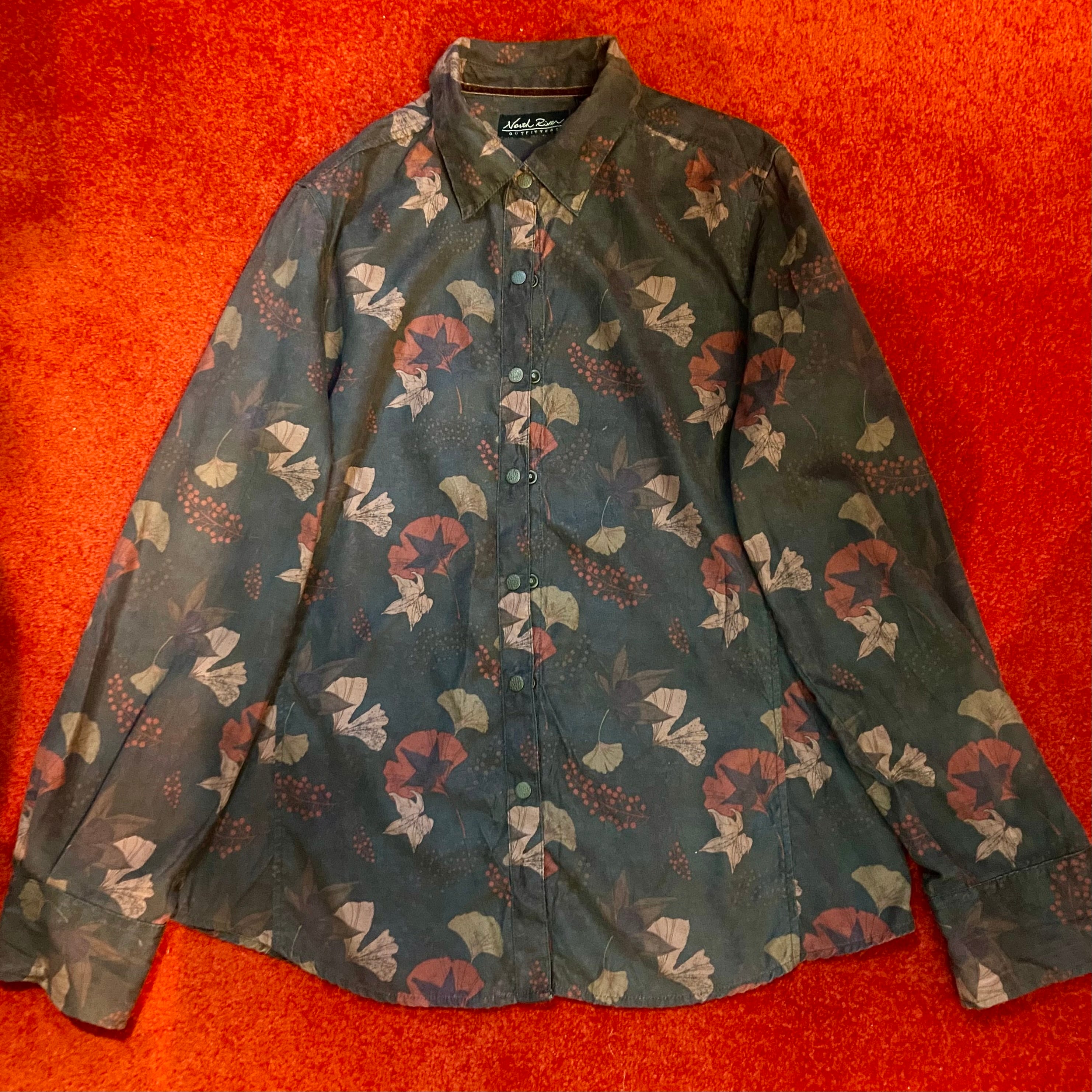 着るだけで秋のムード高まる落ち葉の模様のシャツ。