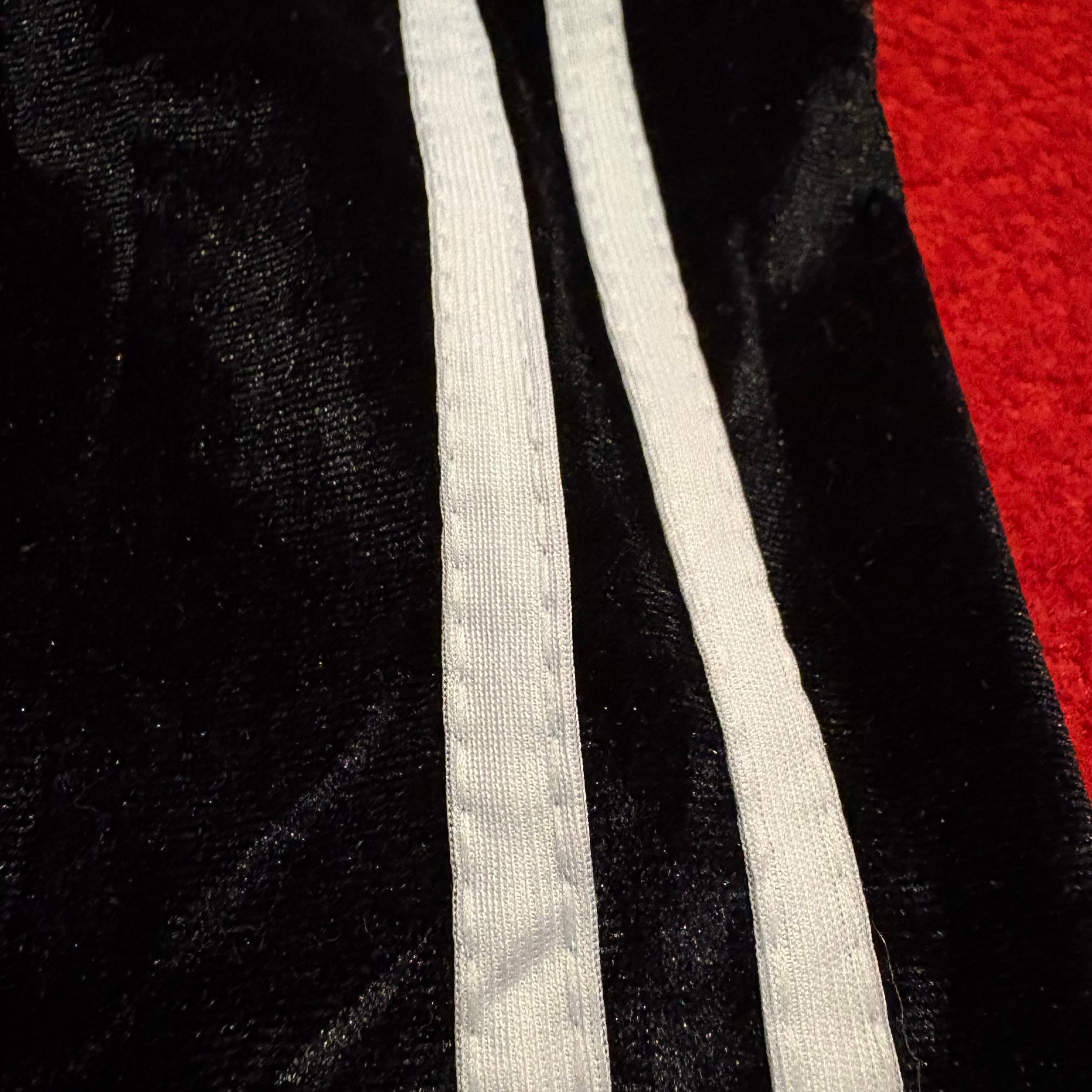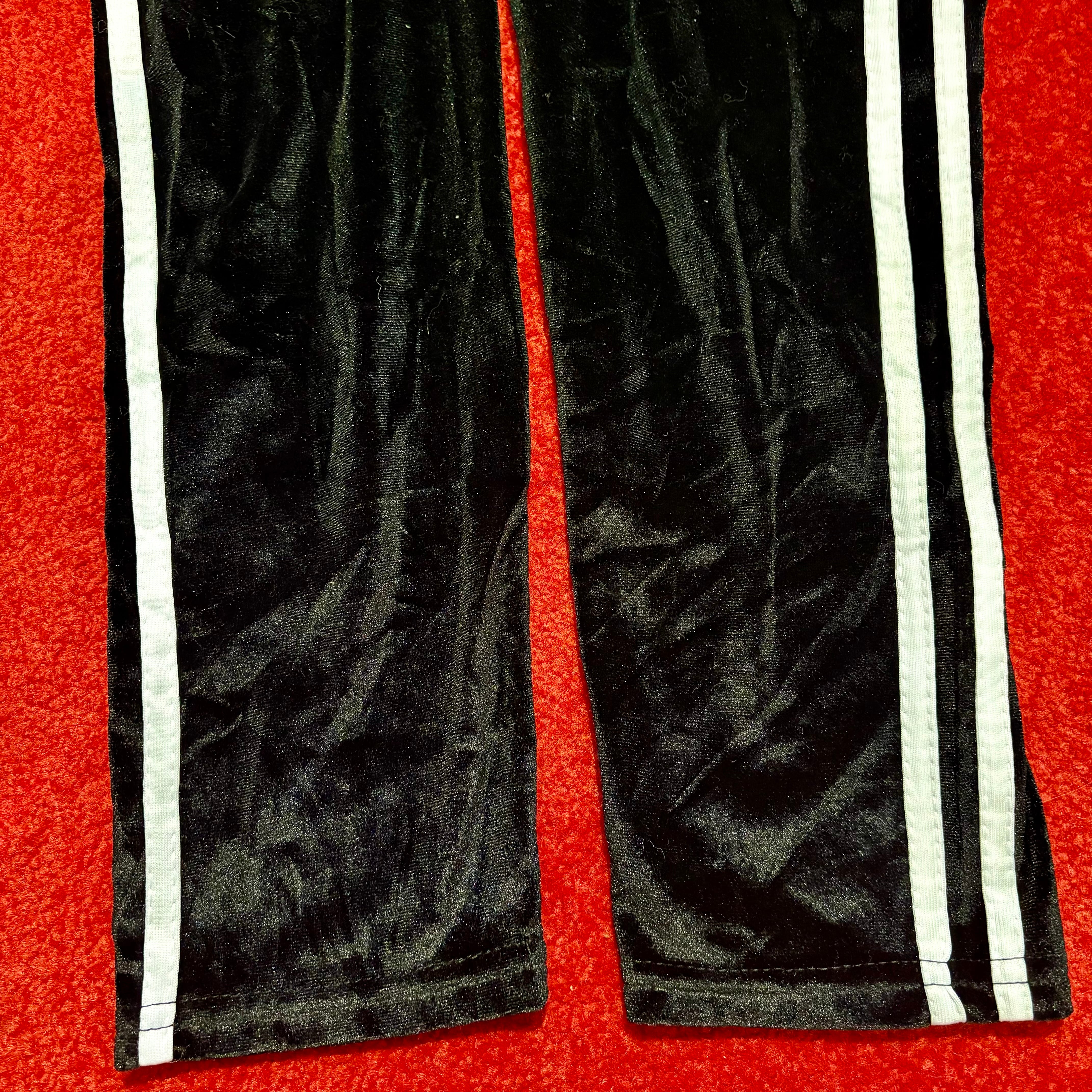 白のサイドラインがアクセントになった黒のストレッチベロアレギンス。