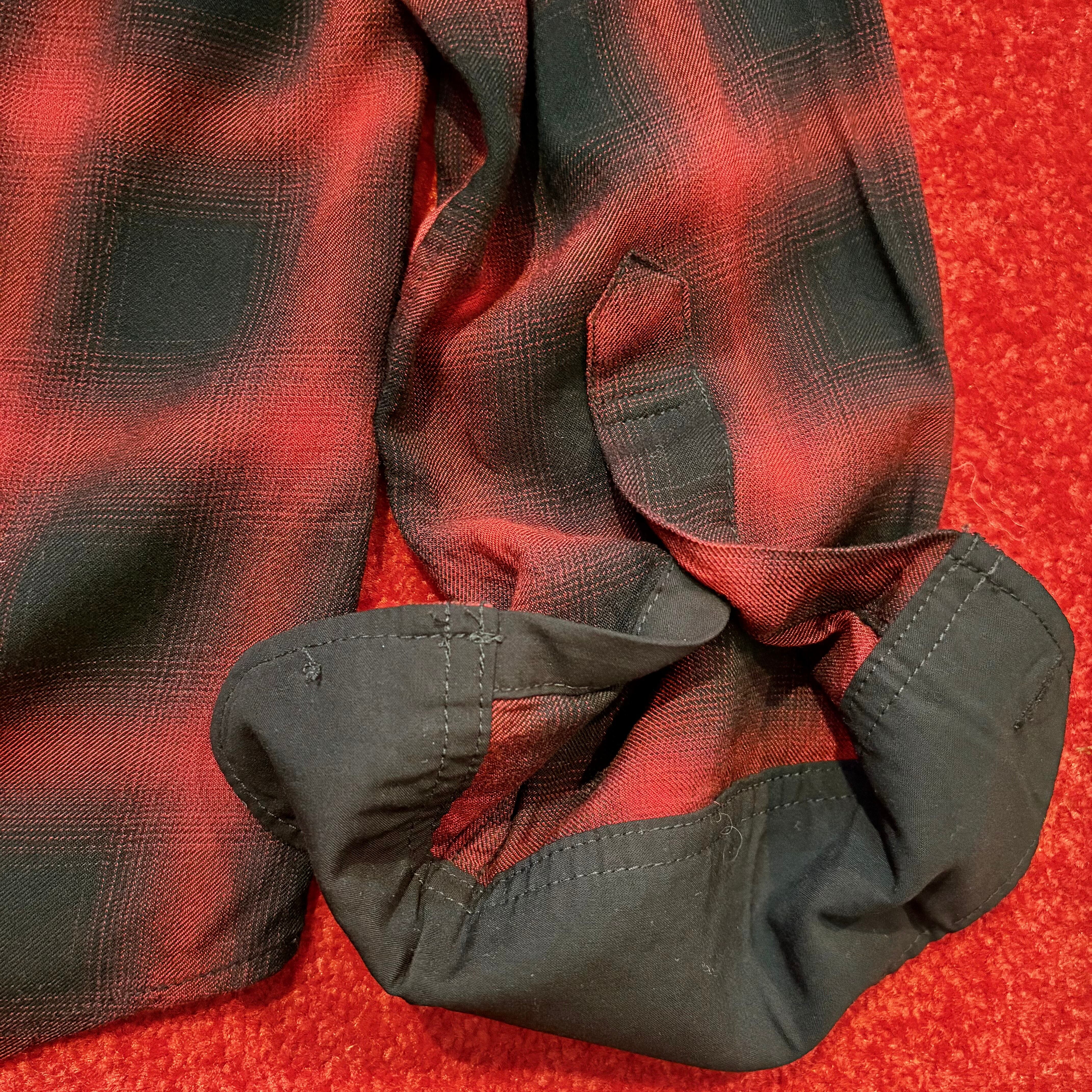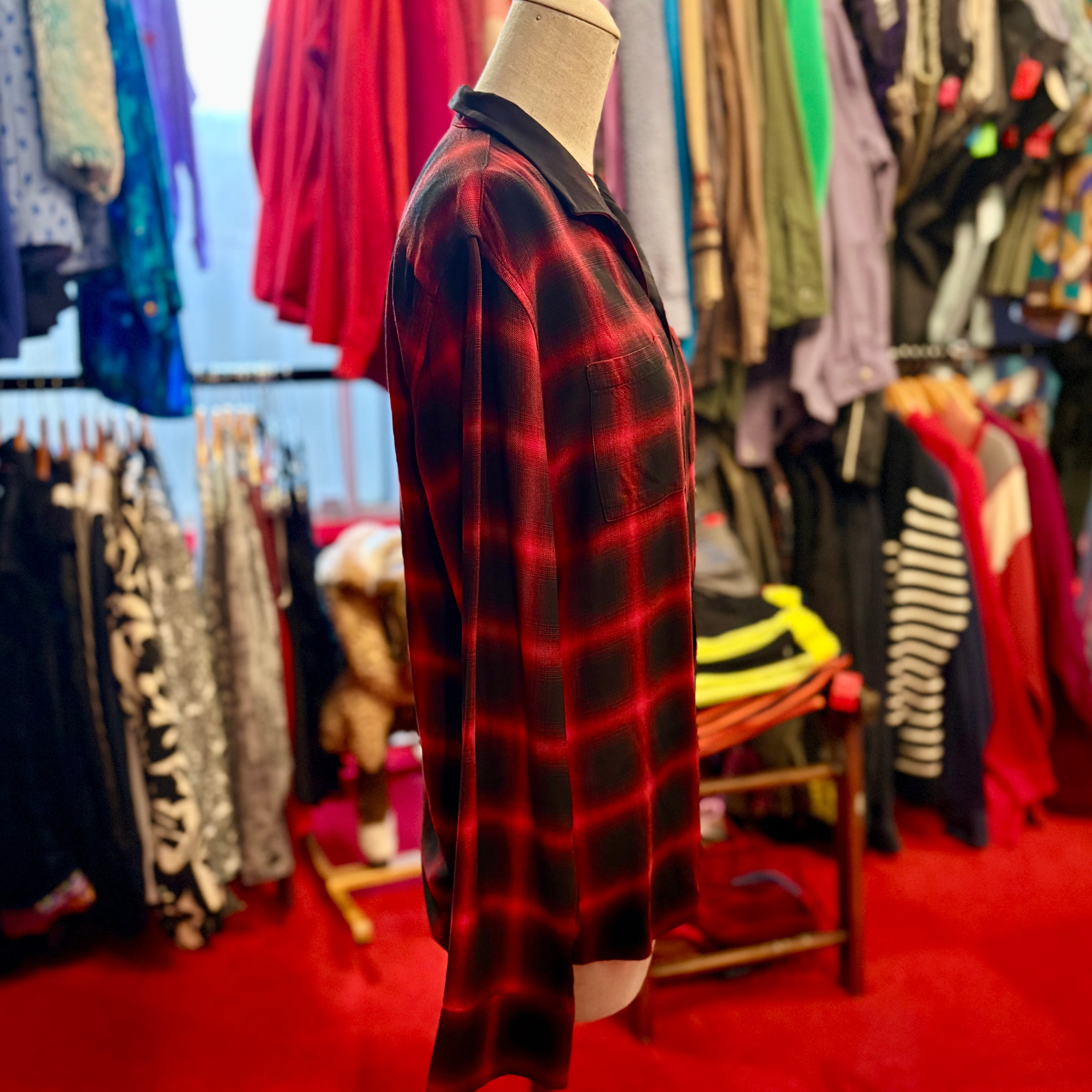 ヴィンテージライクな赤黒チェックの長袖レーヨンシャツ。