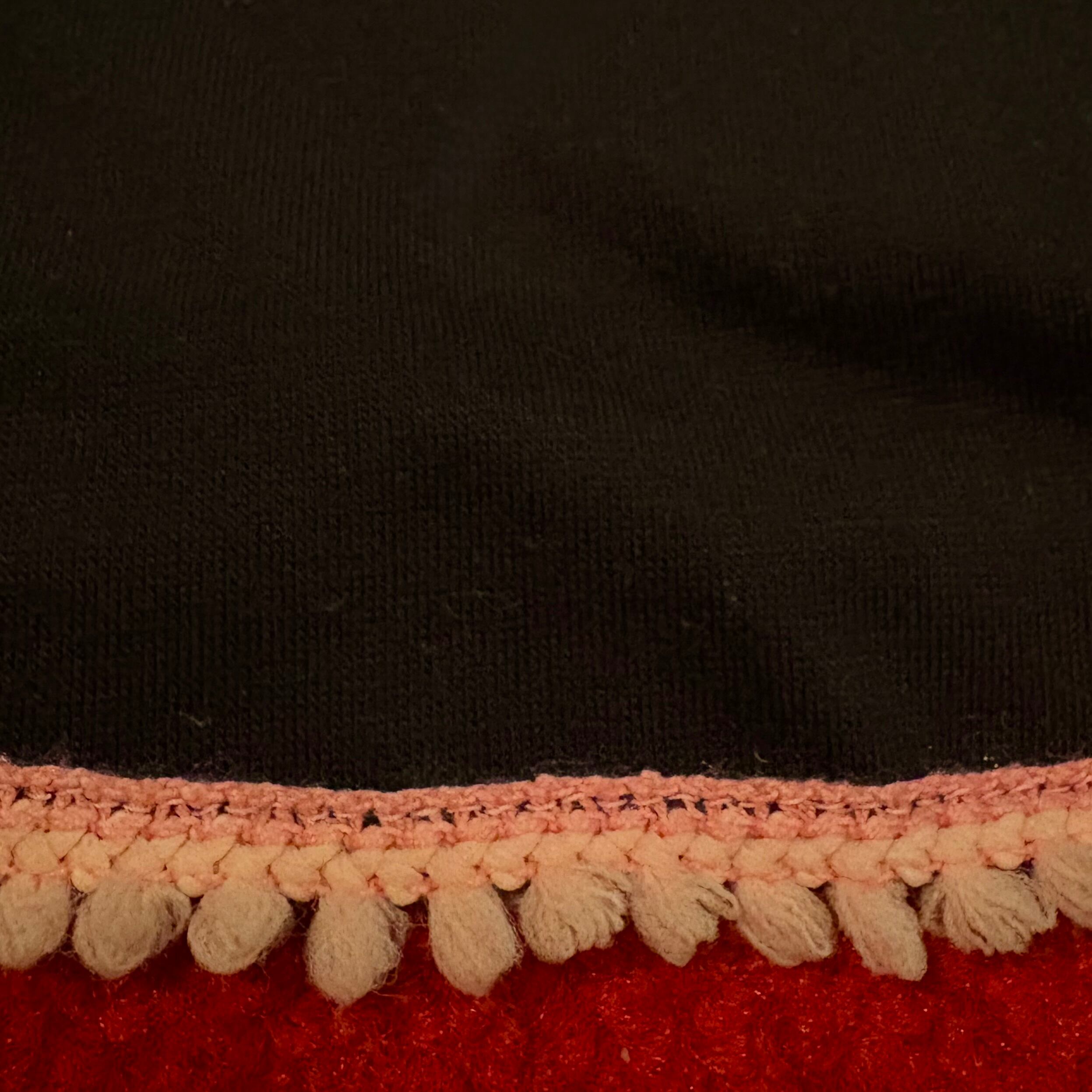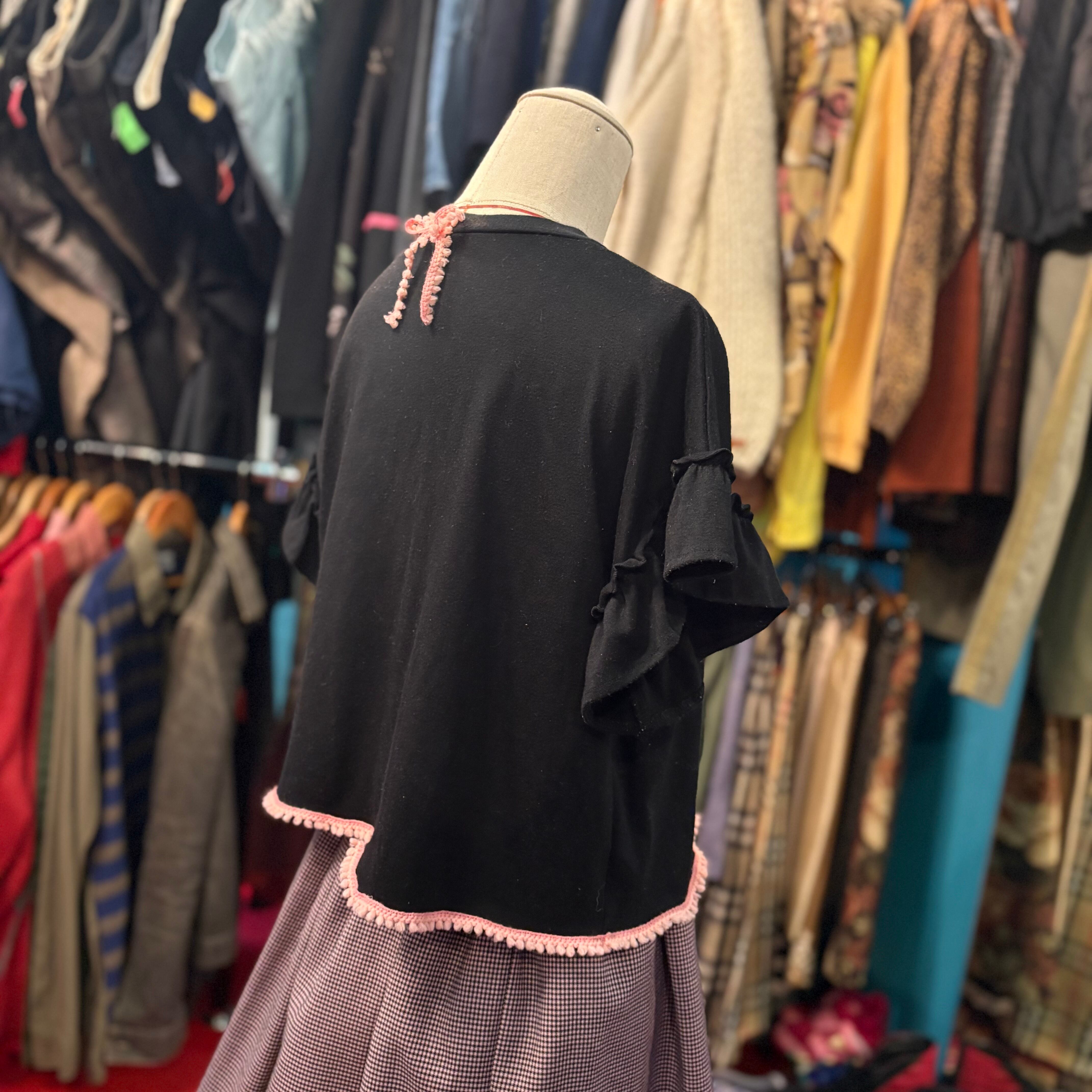 フリル袖にピンクの裾のフリンジリボンが可愛らしいリメイクTシャツ。